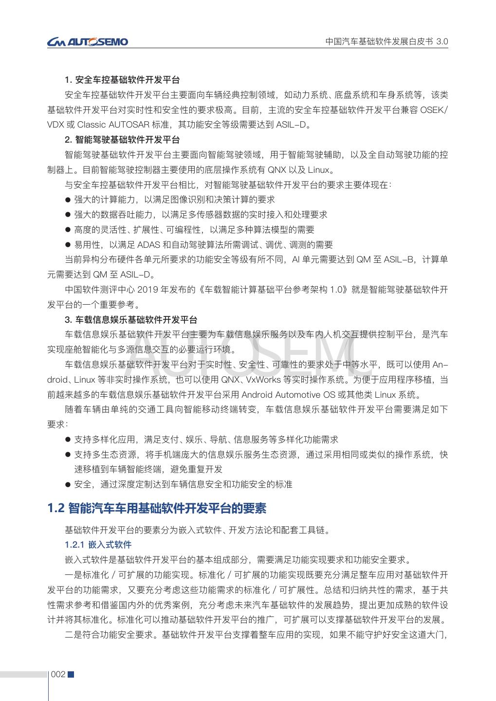8 . 中国汽车基础软件发展白皮书 3.0 1. 安全车控基础软件开发平台 安全车控基础软件开发平台主要面向车辆经典控制领域,如动力系统、底盘系统和车身系统等,该类 基础软件开发平台对实时性和安全性的要求极高。目前,主流的安全车控基础软件开发平台兼容 OSEK/ VDX 或 Classic AUTOSAR 标准,其功能安全等级需要达到 ASIL-D。 2. 智能驾驶基础软件开发平台 智能驾驶基础软件开发平台主要面向智能驾驶领域,用于智能驾驶辅助,以及全自动驾驶功能的控 制器上。目前智能驾驶控制器主要使用的底层操作系统有 QNX 以及 Linux。 与安全车控基础软件开发平台相比,对智能驾驶基础软件开发平台的要求主要体现在: l 强大的计算能力,以满足图像识别和决策计算的要求 l 强大的数据吞吐能力,以满足多传感器数据的实时接入和处理要求 l 高度的灵活性、扩展性、可编程性,以满足多种算法模型的需要 l 易用性,以满足 ADAS 和自动驾驶算法所需调试、调优、调测的需要 当前异构分布硬件各单元所要求的功能安全等级有所不同,AI 单元需要达到 QM 至 ASIL-B,计算单 元需要达到 QM 至 ASIL-D。 中国软件测评中心 2019 年发布的《车载智能计算基础平台参考架构 1.0》就是智能驾驶基础软件开 发平台的一个重要参考。 3. 车载信息娱乐基础软件开发平台 AUTOSEMO 车载信息娱乐基础软件开发平台主要为车载信息娱乐服务以及车内人机交互提供控制平台,是汽车 实现座舱智能化与多源信息交互的必要运行环境。 车载信息娱乐基础软件开发平台对于实时性、安全性、可靠性的要求处于中等水平,既可以使用 An- droid、Linux 等非实时操作系统,也可以使用 QNX、VxWorks 等实时操作系统。为便于应用程序移植,当 前越来越多的车载信息娱乐基础软件开发平台采用 Android Automotive OS 或其他类 Linux 系统。 随着车辆由单纯的交通工具向智能移动终端转变,车载信息娱乐基础软件开发平台需要满足如下 要求: l 支持多样化应用,满足支付、娱乐、导航、信息服务等多样化功能需求 l 支持多生态资源,将手机端庞大的信息娱乐服务生态资源,通过采用相同或类似的操作系统,快 速移植到车辆智能终端,避免重复开发 l 安全,通过深度定制达到车辆信息安全和功能安全的标准 1.2 智能汽车车用基础软件开发平台的要素 基础软件开发平台的要素分为嵌入式软件、开发方法论和配套工具链。 1.2.1 嵌入式软件 嵌入式软件是基础软件开发平台的基本组成部分,需要满足功能实现要求和功能安全要求。 一是标准化 / 可扩展的功能实现。标准化 / 可扩展的功能实现既要充分满足整车应用对基础软件开 发平台的功能需求,又要充分考虑这些功能需求的标准化 / 可扩展性。总结和归纳共性的需求,基于共 性需求参考和借鉴国内外的优秀案例,充分考虑未来汽车基础软件的发展趋势,提出更加成熟的软件设 计并将其标准化。标准化可以推动基础软件开发平台的推广,可扩展可以支撑基础软件开发平台的发展。 二是符合功能安全要求。基础软件开发平台支撑着整车应用的实现,如果不能守护好安全这道大门, 002