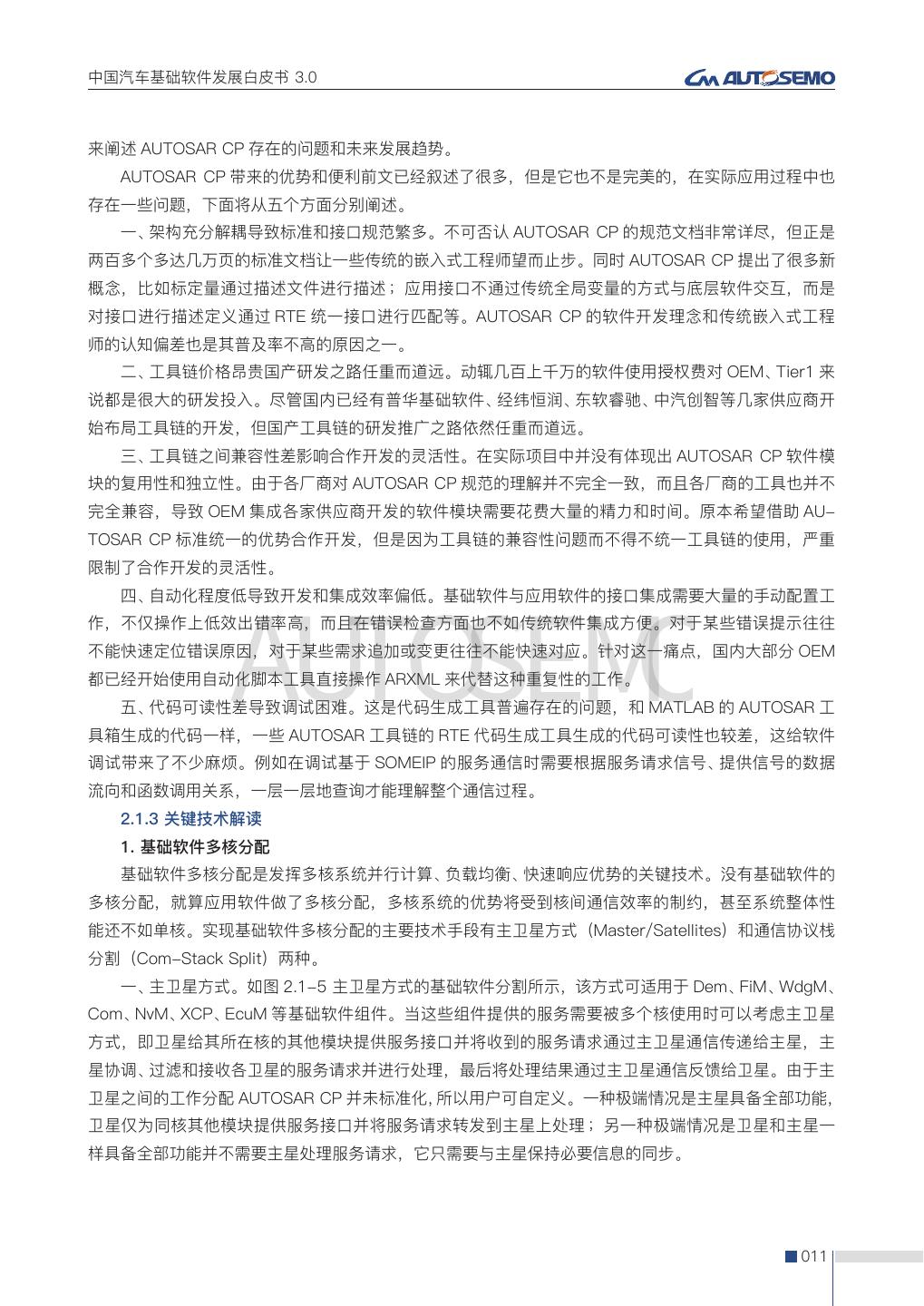 17 .中国汽车基础软件发展白皮书 3.0 来阐述 AUTOSAR CP 存在的问题和未来发展趋势。 AUTOSAR CP 带来的优势和便利前文已经叙述了很多,但是它也不是完美的,在实际应用过程中也 存在一些问题,下面将从五个方面分别阐述。 一、架构充分解耦导致标准和接口规范繁多。不可否认 AUTOSAR CP 的规范文档非常详尽,但正是 两百多个多达几万页的标准文档让一些传统的嵌入式工程师望而止步。同时 AUTOSAR CP 提出了很多新 概念,比如标定量通过描述文件进行描述 ;应用接口不通过传统全局变量的方式与底层软件交互,而是 对接口进行描述定义通过 RTE 统一接口进行匹配等。AUTOSAR CP 的软件开发理念和传统嵌入式工程 师的认知偏差也是其普及率不高的原因之一。 二、工具链价格昂贵国产研发之路任重而道远。动辄几百上千万的软件使用授权费对 OEM、Tier1 来 说都是很大的研发投入。尽管国内已经有普华基础软件、经纬恒润、东软睿驰、中汽创智等几家供应商开 始布局工具链的开发,但国产工具链的研发推广之路依然任重而道远。 三、工具链之间兼容性差影响合作开发的灵活性。在实际项目中并没有体现出 AUTOSAR CP 软件模 块的复用性和独立性。由于各厂商对 AUTOSAR CP 规范的理解并不完全一致,而且各厂商的工具也并不 完全兼容,导致 OEM 集成各家供应商开发的软件模块需要花费大量的精力和时间。原本希望借助 AU- TOSAR CP 标准统一的优势合作开发,但是因为工具链的兼容性问题而不得不统一工具链的使用,严重 限制了合作开发的灵活性。 四、自动化程度低导致开发和集成效率偏低。基础软件与应用软件的接口集成需要大量的手动配置工 AUTOSEMO 作,不仅操作上低效出错率高,而且在错误检查方面也不如传统软件集成方便。对于某些错误提示往往 不能快速定位错误原因,对于某些需求追加或变更往往不能快速对应。针对这一痛点,国内大部分 OEM 都已经开始使用自动化脚本工具直接操作 ARXML 来代替这种重复性的工作。 五、代码可读性差导致调试困难。这是代码生成工具普遍存在的问题,和 MATLAB 的 AUTOSAR 工 具箱生成的代码一样,一些 AUTOSAR 工具链的 RTE 代码生成工具生成的代码可读性也较差,这给软件 调试带来了不少麻烦。例如在调试基于 SOMEIP 的服务通信时需要根据服务请求信号、提供信号的数据 流向和函数调用关系,一层一层地查询才能理解整个通信过程。 2.1.3 关键技术解读 1. 基础软件多核分配 基础软件多核分配是发挥多核系统并行计算、负载均衡、快速响应优势的关键技术。没有基础软件的 多核分配,就算应用软件做了多核分配,多核系统的优势将受到核间通信效率的制约,甚至系统整体性 能还不如单核。实现基础软件多核分配的主要技术手段有主卫星方式(Master/Satellites)和通信协议栈 分割(Com-Stack Split)两种。 一、主卫星方式。如图 2.1-5 主卫星方式的基础软件分割所示,该方式可适用于 Dem、FiM、WdgM、 Com、NvM、XCP、EcuM 等基础软件组件。当这些组件提供的服务需要被多个核使用时可以考虑主卫星 方式,即卫星给其所在核的其他模块提供服务接口并将收到的服务请求通过主卫星通信传递给主星,主 星协调、过滤和接收各卫星的服务请求并进行处理,最后将处理结果通过主卫星通信反馈给卫星。由于主 卫星之间的工作分配 AUTOSAR CP 并未标准化,所以用户可自定义。一种极端情况是主星具备全部功能, 卫星仅为同核其他模块提供服务接口并将服务请求转发到主星上处理 ;另一种极端情况是卫星和主星一 样具备全部功能并不需要主星处理服务请求,它只需要与主星保持必要信息的同步。 011