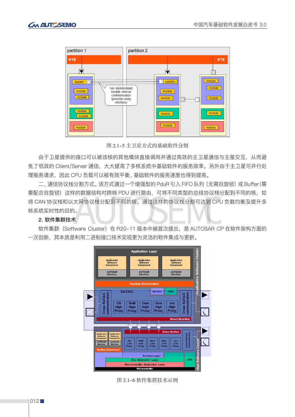 18 . 中国汽车基础软件发展白皮书 3.0 图 2.1-5 主卫星方式的基础软件分割 由于卫星提供的接口可以被该核的其他模块直接调用并通过高效的主卫星通信与主星交互,从而避 免了低效的 Client/Server 通信,大大提高了多核系统中基础软件的服务效率。另外由于主卫星可并行处 理服务请求,因此 CPU 负载可以被有效平衡、基础软件的服务速度也得到提高。 二、通信协议栈分割方式。该方式通过一个增强型的 PduR 引入 FIFO 队列(无需自旋锁)或 Buffer(需 要配合自旋锁)这样的数据结构对跨核 PDU 进行路由,可将不同类型的总线协议栈分配到不同的核,如 AUTOSEMO 将 CAN 协议栈和以太网协议栈分配到不同的核。通过这样的协议栈分割可达到 CPU 负载均衡及提升多 核系统实时性的目的。 2. 软件集群技术 软件集群(Software Cluster)在 R20-11 版本中被首次提出,是 AUTOSAR CP 在软件架构方面的 一次创新,其本质是利用二进制接口技术实现更为灵活的软件集成与更新。 图 2.1-6 软件集群技术示例 012