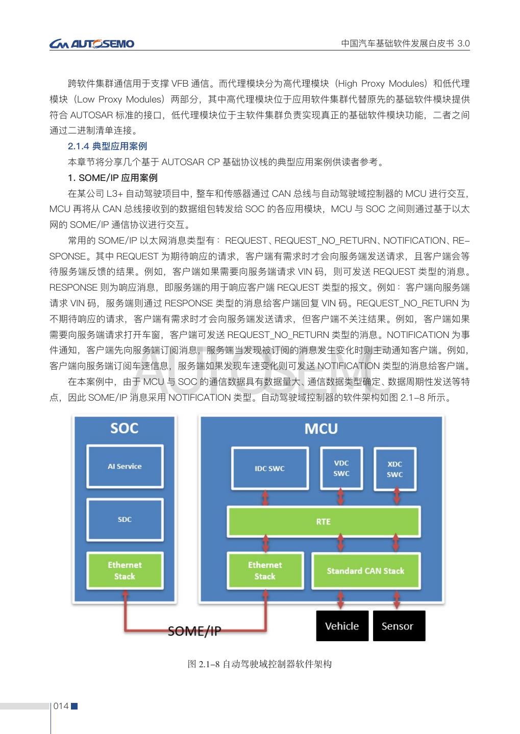 20 . 中国汽车基础软件发展白皮书 3.0 跨软件集群通信用于支撑 VFB 通信。而代理模块分为高代理模块(High Proxy Modules)和低代理 模块(Low Proxy Modules)两部分,其中高代理模块位于应用软件集群代替原先的基础软件模块提供 符合 AUTOSAR 标准的接口,低代理模块位于主软件集群负责实现真正的基础软件模块功能,二者之间 通过二进制清单连接。 2.1.4 典型应用案例 本章节将分享几个基于 AUTOSAR CP 基础协议栈的典型应用案例供读者参考。 1. SOME/IP 应用案例 在某公司 L3+ 自动驾驶项目中,整车和传感器通过 CAN 总线与自动驾驶域控制器的 MCU 进行交互, MCU 再将从 CAN 总线接收到的数据组包转发给 SOC 的各应用模块,MCU 与 SOC 之间则通过基于以太 网的 SOME/IP 通信协议进行交互。 常用的 SOME/IP 以太网消息类型有 :REQUEST、REQUEST_NO_RETURN、NOTIFICATION、RE- SPONSE。其中 REQUEST 为期待响应的请求,客户端有需求时才会向服务端发送请求,且客户端会等 待服务端反馈的结果。例如,客户端如果需要向服务端请求 VIN 码,则可发送 REQUEST 类型的消息。 RESPONSE 则为响应消息,即服务端的用于响应客户端 REQUEST 类型的报文。例如 :客户端向服务端 请求 VIN 码,服务端则通过 RESPONSE 类型的消息给客户端回复 VIN 码。REQUEST_NO_RETURN 为 不期待响应的请求,客户端有需求时才会向服务端发送请求,但客户端不关注结果。例如,客户端如果 需要向服务端请求打开车窗,客户端可发送 REQUEST_NO_RETURN 类型的消息。NOTIFICATION 为事 AUTOSEMO 件通知,客户端先向服务端订阅消息,服务端当发现被订阅的消息发生变化时则主动通知客户端。例如, 客户端向服务端订阅车速信息,服务端如果发现车速变化则可发送 NOTIFICATION 类型的消息给客户端。 在本案例中,由于 MCU 与 SOC 的通信数据具有数据量大、通信数据类型确定、数据周期性发送等特 点,因此 SOME/IP 消息采用 NOTIFICATION 类型。自动驾驶域控制器的软件架构如图 2.1-8 所示。 图 2.1-8 自动驾驶域控制器软件架构 014
