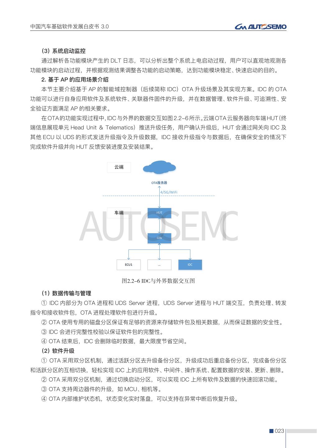 29 .中国汽车基础软件发展白皮书 3.0 (3)系统启动监控 通过解析各功能模块产生的 DLT 日志,可以分析出整个系统上电启动过程,用户可以直观地观测各 功能模块的启动过程,并根据观测结果调整各功能的启动策略,达到功能模块稳定、快速启动的目的。 2. 基于 AP 的应用场景介绍 本节主要介绍基于 AP 的智能域控制器(后续简称 IDC)OTA 升级场景及其实现方案。IDC 的 OTA 功能可以进行自身应用软件及系统软件、关联器件固件的升级,并在数据管理、软件升级、可追溯性、安 全验证方面满足 AP 的相关要求。 在 OTA 的功能实现过程中, IDC 与外界的数据交互如图 2.2-6 所示。 云端 OTA 云服务器向车端 HUT (终 端信息展现单元 Head Unit & Telematics)推送升级任务,用户确认升级后,HUT 会通过网关向 IDC 及 其他 ECU 以 UDS 的形式发送升级指令及升级数据,IDC 接收升级指令与数据后,在确保安全的情况下 完成软件升级并向 HUT 反馈安装进度及安装结果。 云端 OTA服务器 4/5G/WiFi AUTOSEMO 车端 HUT GW ECU1 ... IDC 图2.2-6 IDC与外界数据交互图 (1)数据传输与管理 ① IDC 内部分为 OTA 进程和 UDS Server 进程,UDS Server 进程与 HUT 端交互,负责处理、转发 指令和接收软件包,OTA 进程处理软件包进行升级。 ② OTA 使用专用的磁盘分区保证有足够的资源来存储软件包及相关数据,从而保证数据的安全性。 ③ IDC 会进行完整性校验以保证软件包的完整性。 ④ OTA 结束后,IDC 会删除临时数据,最大限度节省空间。 (2)软件升级 ① OTA 采用双分区机制,通过活跃分区去升级备份分区,升级成功后重启备份分区,完成备份分区 和活跃分区的互相切换,轻松实现 IDC 上的应用软件、中间件、操作系统、配置数据的安装、更新、删除。 ② OTA 采用双分区机制,通过切换启动分区,可以实现 IDC 上所有软件及数据的快速回滚功能。 ③ OTA 支持周边器件的升级,如 MCU、相机等。 ④ OTA 内部维护状态机,状态变化实时落盘,可以支持在异常中断后恢复升级。 023