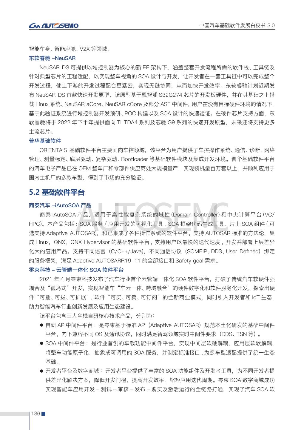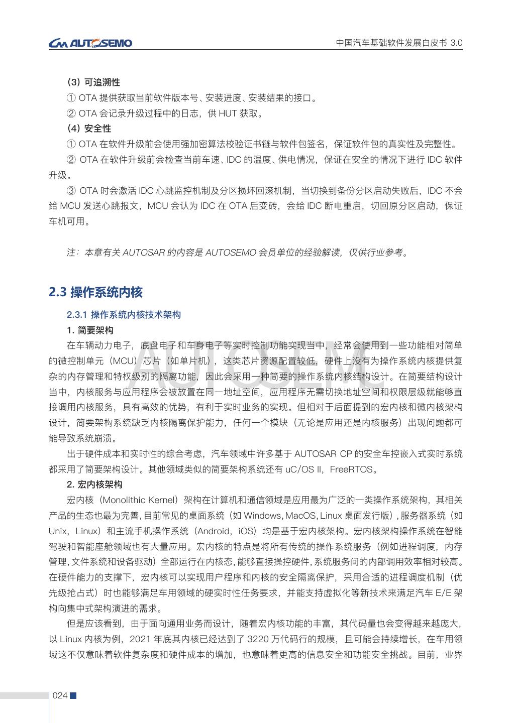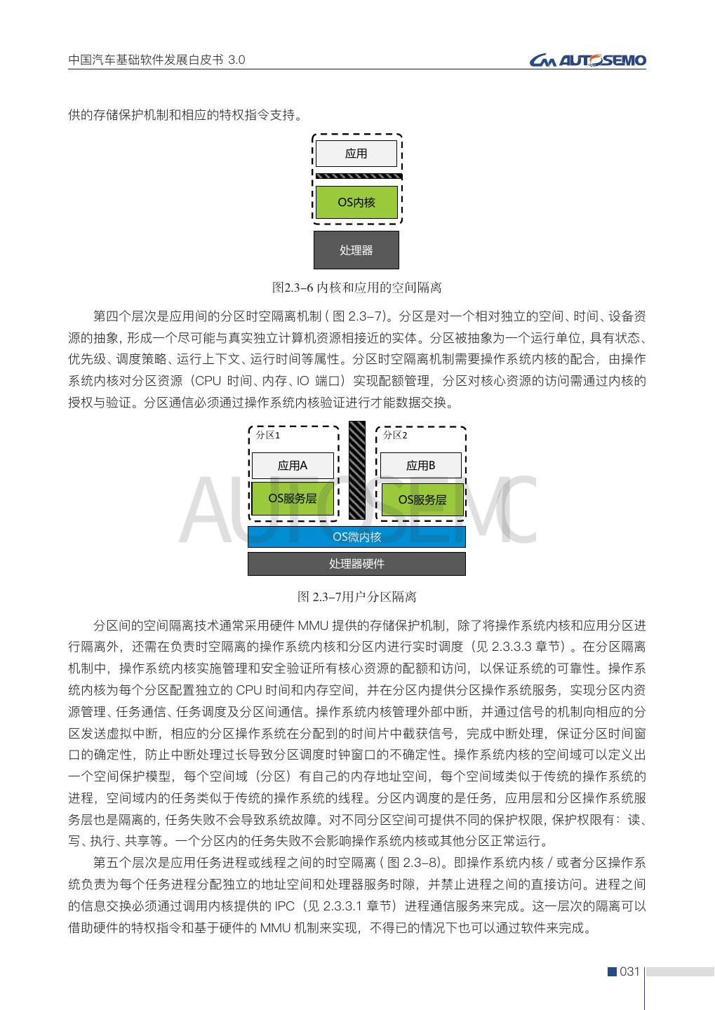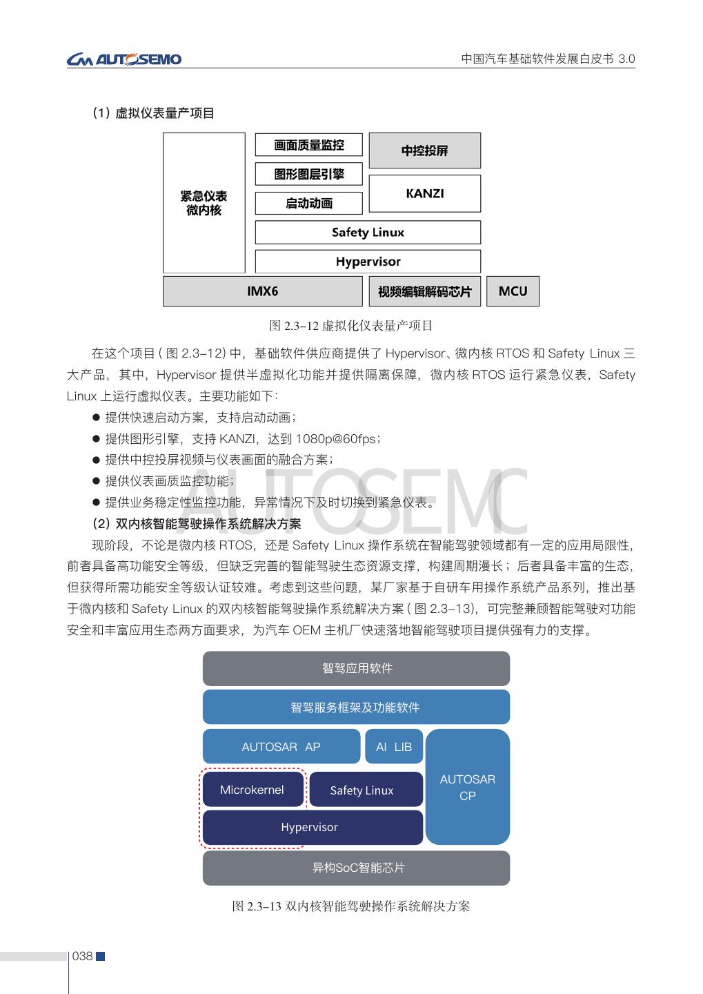 4 .中国汽车基础软件发展白皮书 3.0 目录 CONTENTS 第 1章 智能汽车车用基础软件平台概述 1.1 智能汽车车用基础软件平台的定义与分类�����������������������001 1.1.1 智能汽车车用基础软件平台定义������������������������001 1.1.2 智能汽车车用基础软件开发平台分类����������������������001 1.2 智能汽车车用基础软件开发平台的要素������������������������002 1.2.1 嵌入式软件���������������������������������002 1.2.2 开发方法论���������������������������������003 1.2.3 配套工具链���������������������������������003 1.3 智能汽车车用基础软件平台发展现状�������������������������004 AUTOSEMO 1.3.1 大众 VW·OS��������������������������������004 1.3.2 丰田 Arene·OS�������������������������������005 1.4 白皮书内容简介����������������������������������005 第 2章 智能汽车车用基础软件的内核和中间件 2.1 AUTOSAR CP����������������������������������007 2.1.1 技术形态����������������������������������007 2.1.2 技术发展趋势��������������������������������010 2.1.3 关键技术解读��������������������������������011 2.1.4 典型应用案例��������������������������������014 2.2 AUTOSAR AP����������������������������������017 2.2.1 技术形态����������������������������������017 2.2.2 技术发展趋势��������������������������������019 2.2.3 关键技术解读��������������������������������021 2.2.4 典型应用案例��������������������������������021 2.3 操作系统内核�����������������������������������024 2.3.1 操作系统内核技术架构����������������������������024 2.3.2 技术发展趋势��������������������������������025 2.3.3 关键技术解读��������������������������������026 2.3.4 典型应用案例��������������������������������037 I