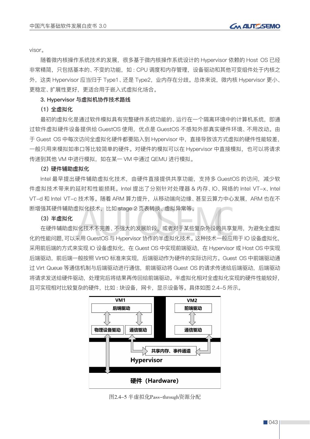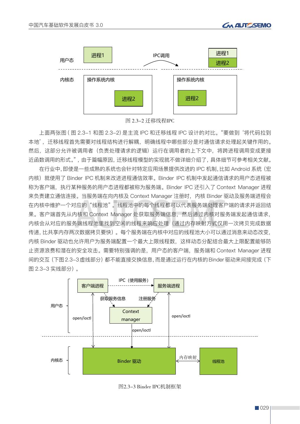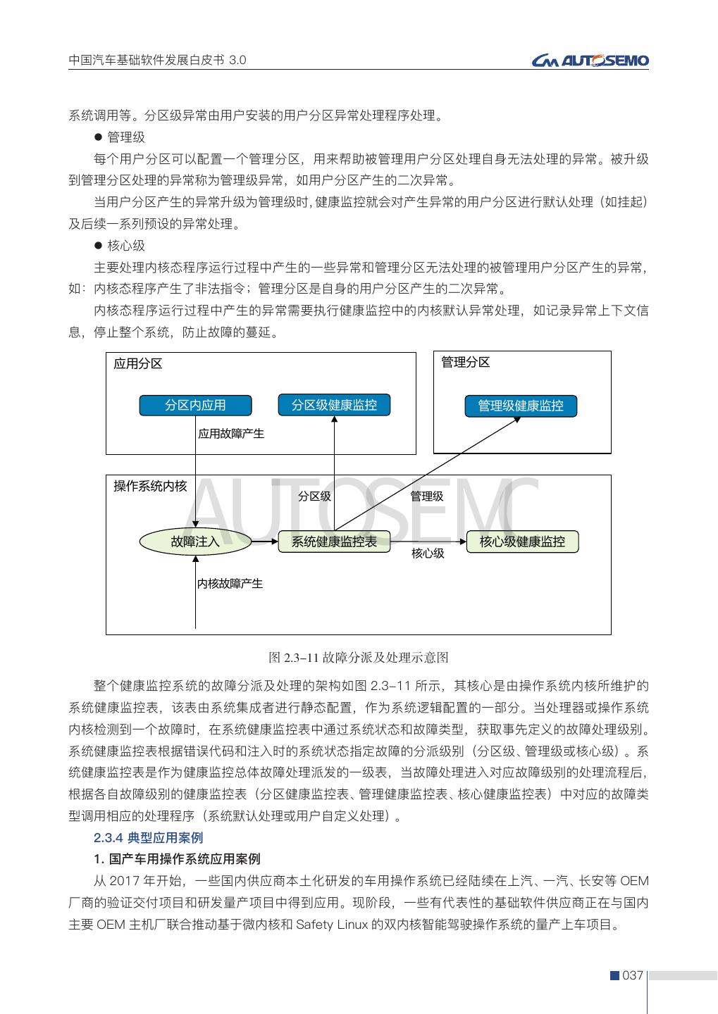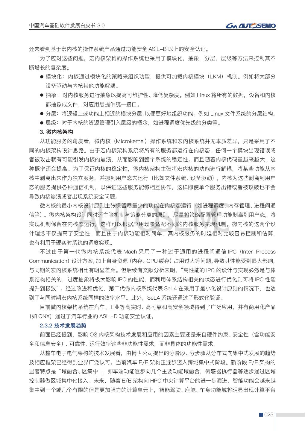 4 .中国汽车基础软件发展白皮书 3.0 目录 CONTENTS 第 1章 智能汽车车用基础软件平台概述 1.1 智能汽车车用基础软件平台的定义与分类�����������������������001 1.1.1 智能汽车车用基础软件平台定义������������������������001 1.1.2 智能汽车车用基础软件开发平台分类����������������������001 1.2 智能汽车车用基础软件开发平台的要素������������������������002 1.2.1 嵌入式软件���������������������������������002 1.2.2 开发方法论���������������������������������003 1.2.3 配套工具链���������������������������������003 1.3 智能汽车车用基础软件平台发展现状�������������������������004 AUTOSEMO 1.3.1 大众 VW·OS��������������������������������004 1.3.2 丰田 Arene·OS�������������������������������005 1.4 白皮书内容简介����������������������������������005 第 2章 智能汽车车用基础软件的内核和中间件 2.1 AUTOSAR CP����������������������������������007 2.1.1 技术形态����������������������������������007 2.1.2 技术发展趋势��������������������������������010 2.1.3 关键技术解读��������������������������������011 2.1.4 典型应用案例��������������������������������014 2.2 AUTOSAR AP����������������������������������017 2.2.1 技术形态����������������������������������017 2.2.2 技术发展趋势��������������������������������019 2.2.3 关键技术解读��������������������������������021 2.2.4 典型应用案例��������������������������������021 2.3 操作系统内核�����������������������������������024 2.3.1 操作系统内核技术架构����������������������������024 2.3.2 技术发展趋势��������������������������������025 2.3.3 关键技术解读��������������������������������026 2.3.4 典型应用案例��������������������������������037 I