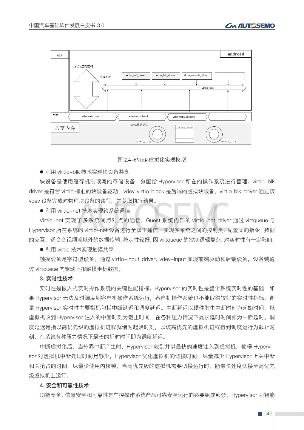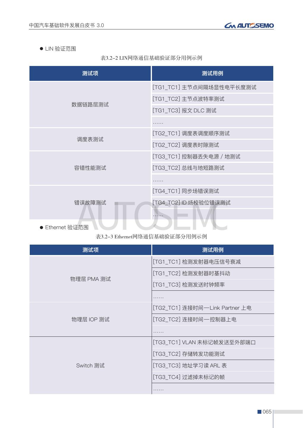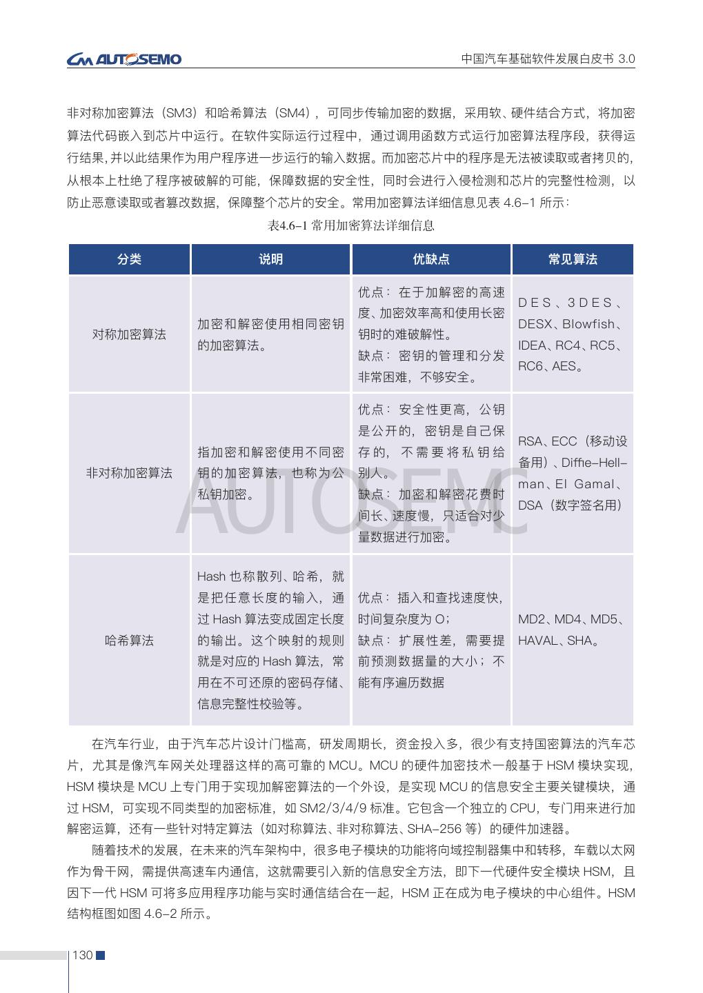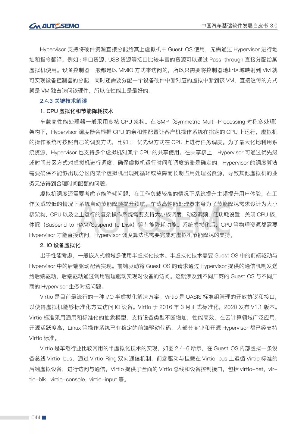 4 .中国汽车基础软件发展白皮书 3.0 目录 CONTENTS 第 1章 智能汽车车用基础软件平台概述 1.1 智能汽车车用基础软件平台的定义与分类�����������������������001 1.1.1 智能汽车车用基础软件平台定义������������������������001 1.1.2 智能汽车车用基础软件开发平台分类����������������������001 1.2 智能汽车车用基础软件开发平台的要素������������������������002 1.2.1 嵌入式软件���������������������������������002 1.2.2 开发方法论���������������������������������003 1.2.3 配套工具链���������������������������������003 1.3 智能汽车车用基础软件平台发展现状�������������������������004 AUTOSEMO 1.3.1 大众 VW·OS��������������������������������004 1.3.2 丰田 Arene·OS�������������������������������005 1.4 白皮书内容简介����������������������������������005 第 2章 智能汽车车用基础软件的内核和中间件 2.1 AUTOSAR CP����������������������������������007 2.1.1 技术形态����������������������������������007 2.1.2 技术发展趋势��������������������������������010 2.1.3 关键技术解读��������������������������������011 2.1.4 典型应用案例��������������������������������014 2.2 AUTOSAR AP����������������������������������017 2.2.1 技术形态����������������������������������017 2.2.2 技术发展趋势��������������������������������019 2.2.3 关键技术解读��������������������������������021 2.2.4 典型应用案例��������������������������������021 2.3 操作系统内核�����������������������������������024 2.3.1 操作系统内核技术架构����������������������������024 2.3.2 技术发展趋势��������������������������������025 2.3.3 关键技术解读��������������������������������026 2.3.4 典型应用案例��������������������������������037 I