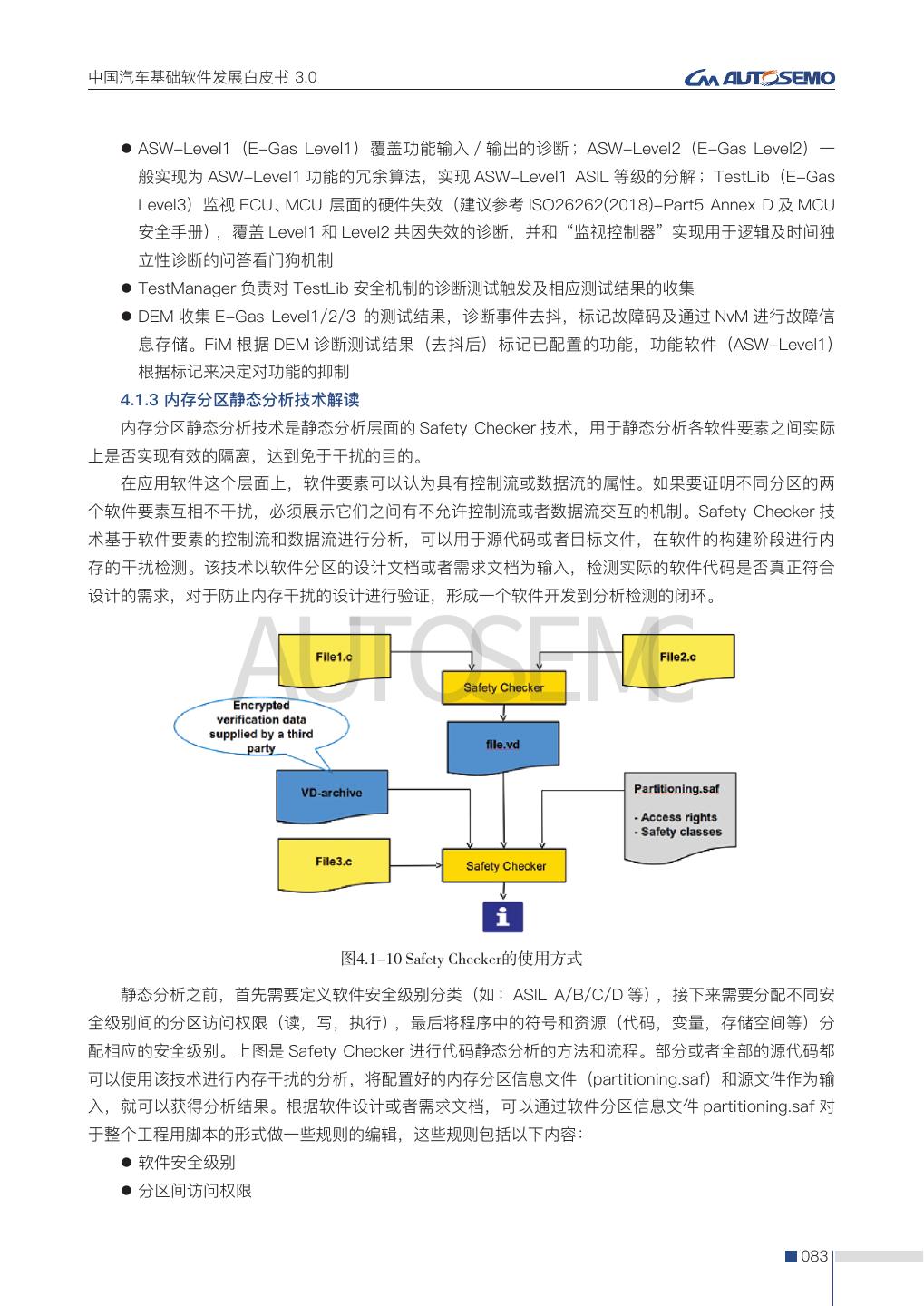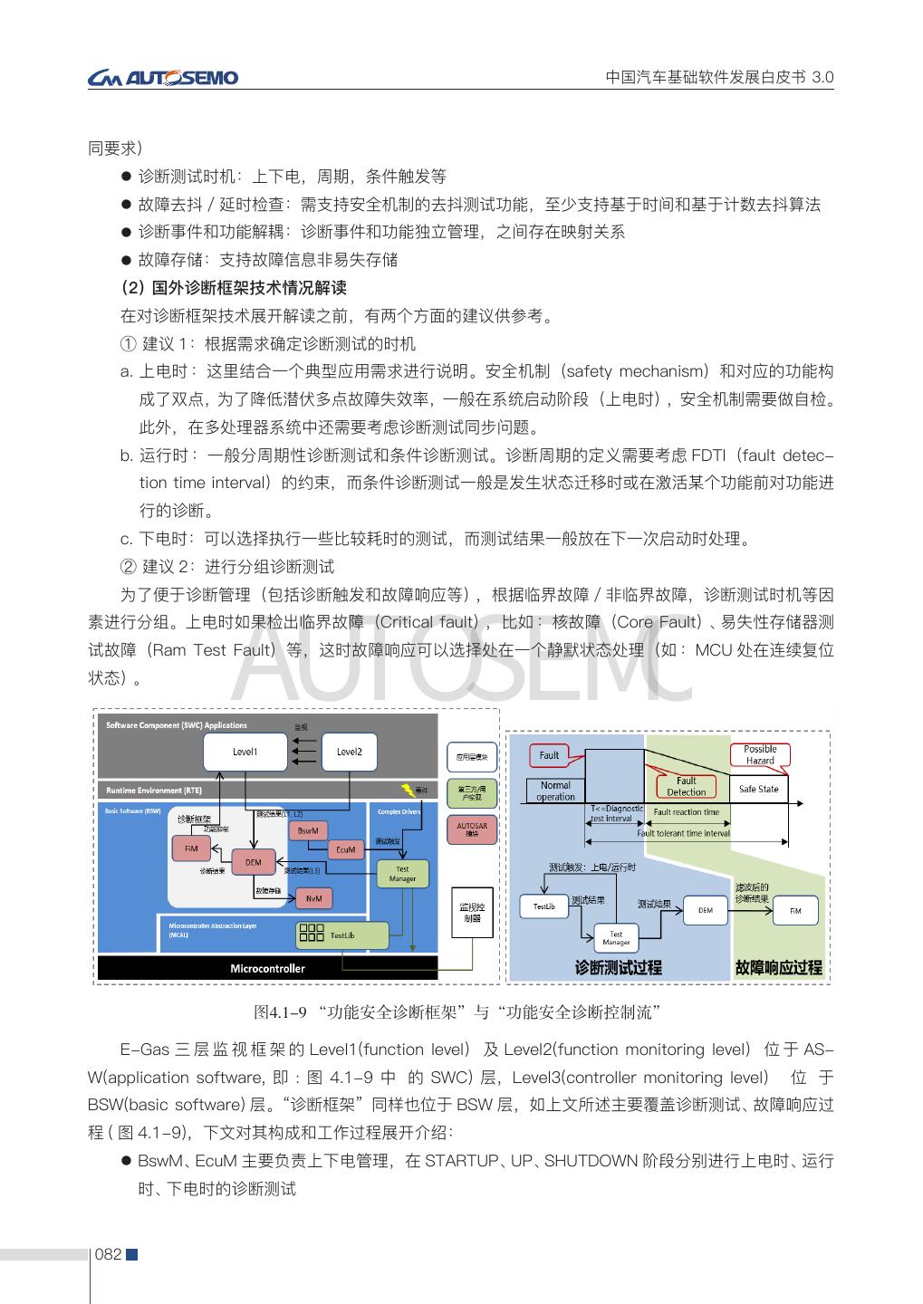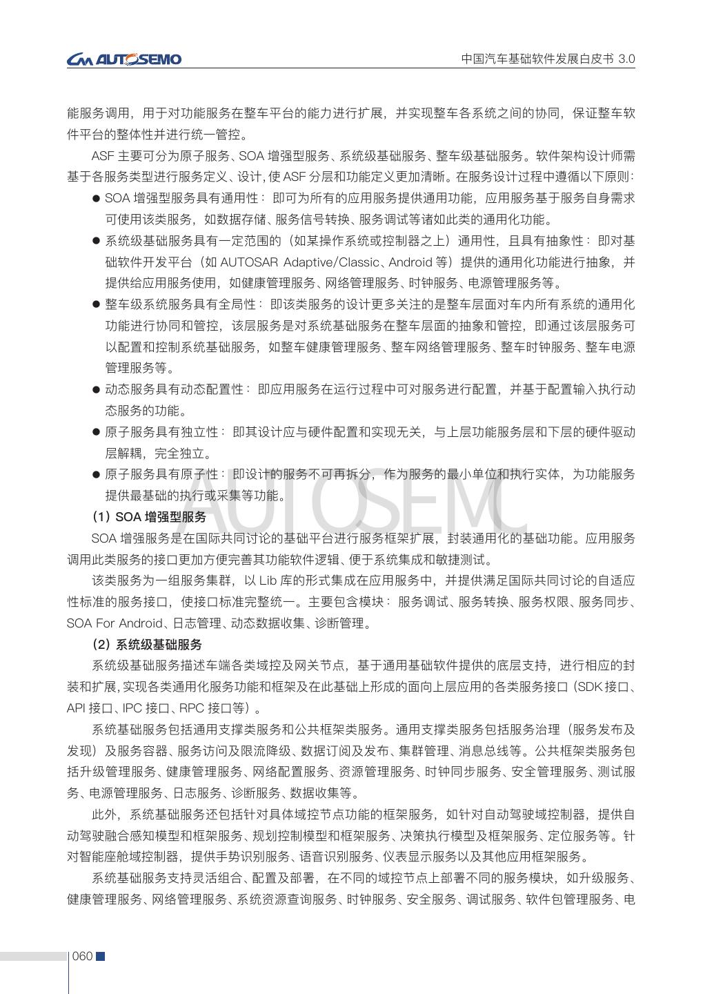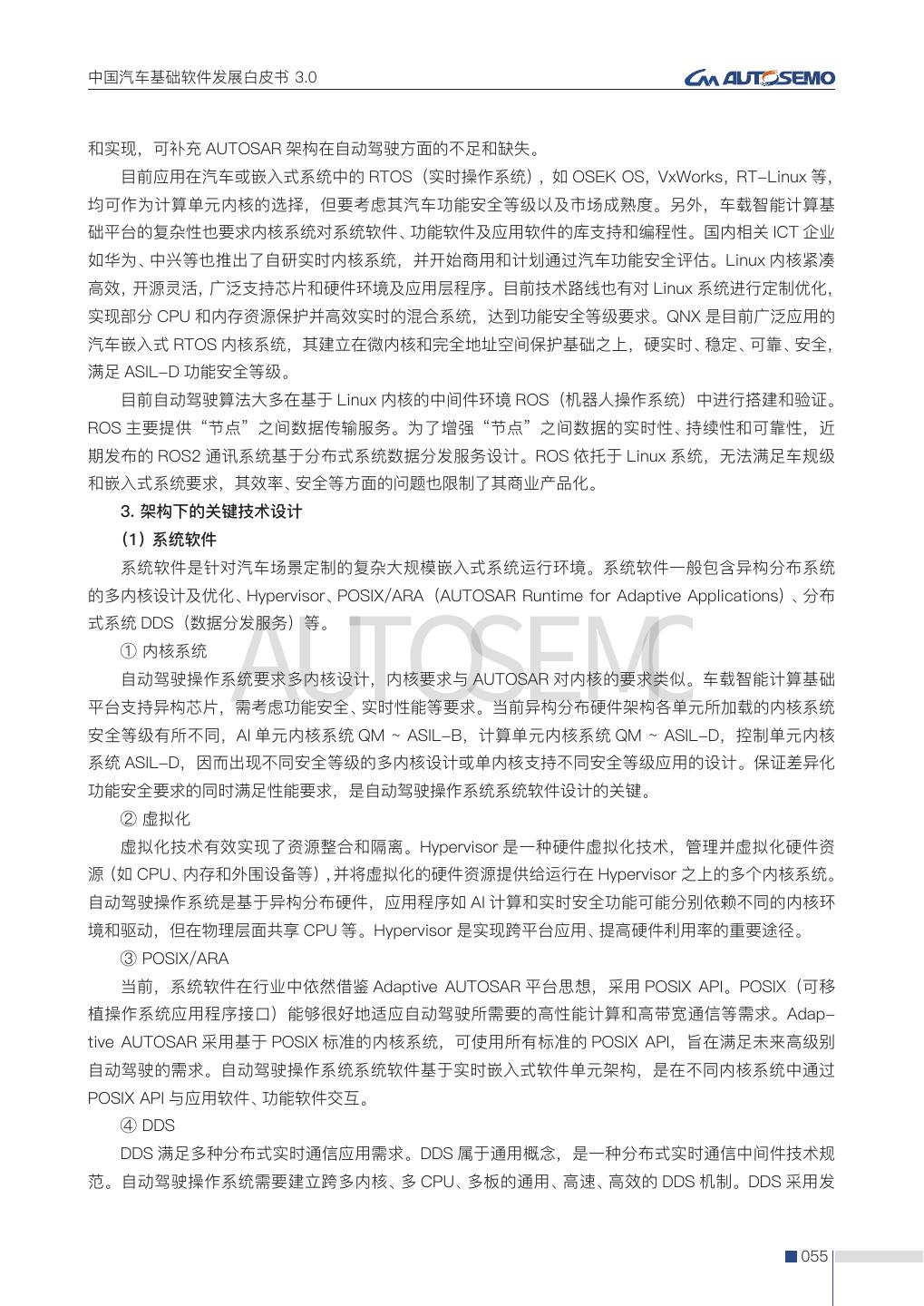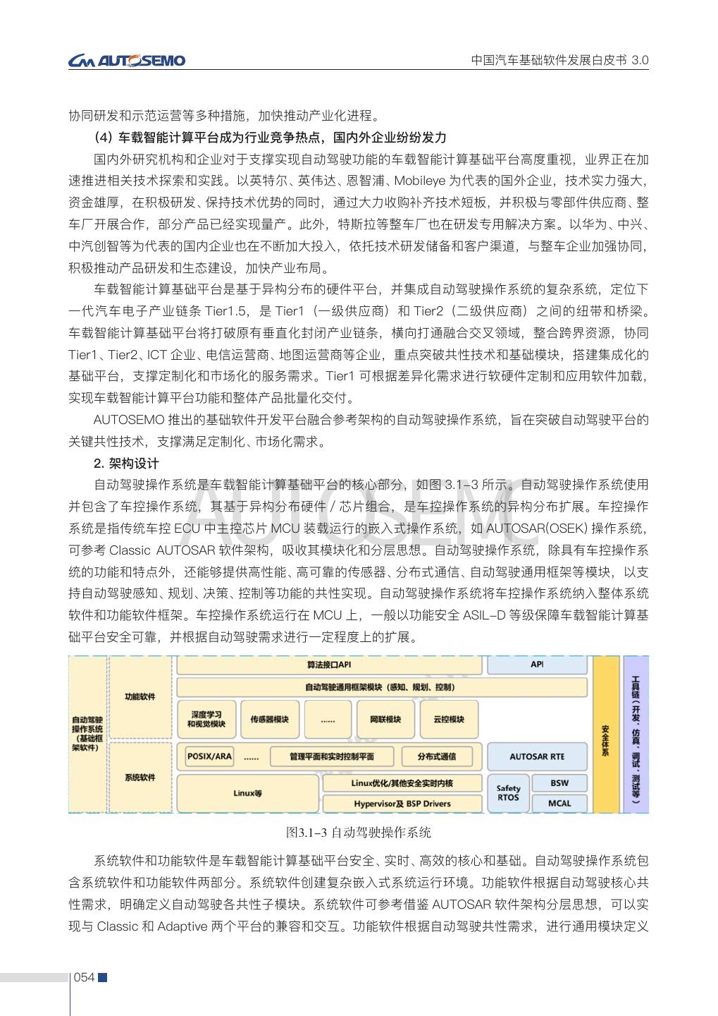 12 . 中国汽车基础软件发展白皮书 3.0 四个方面对基础软件开发平台的重要组成部分 CP AUTOSAR、AP AUTOSAR、操作系统内核、虚拟化进 行介绍。 第 3 章智能汽车车用基础软件平台分别介绍了基于功能软件的自动驾驶平台和基于 ASF (AU- TOSEMO Service Framework) 的生态框架,说明了其组成部分和适用场景。 第 4 章智能汽车车用基础软件开发平台关联技术以六个技术领域为切入点,分别研究了基础软件平 台对支撑功能安全所起的作用 ;研究了基础软件开发平台对支撑信息安全所起的作用 ;研究了边缘计算 如何更好地驾驭数据以支撑车企数字化转型 ;研究了双态开发模型和持续集成持续发布 CI/CD 如何支撑 基础软件开发平台的高效开发 ;研究了几种主流支撑 SOA 的先进车载通信技术 ;研究了车载芯片的发展 趋势及其关键技术。 第 5 章国产基础软件生态介绍描述了国产基础软件生态的发展现状。 第 6 章国产基础软件问题与展望对基础软件平台的未来发展提出了建议。 AUTOSEMO 006