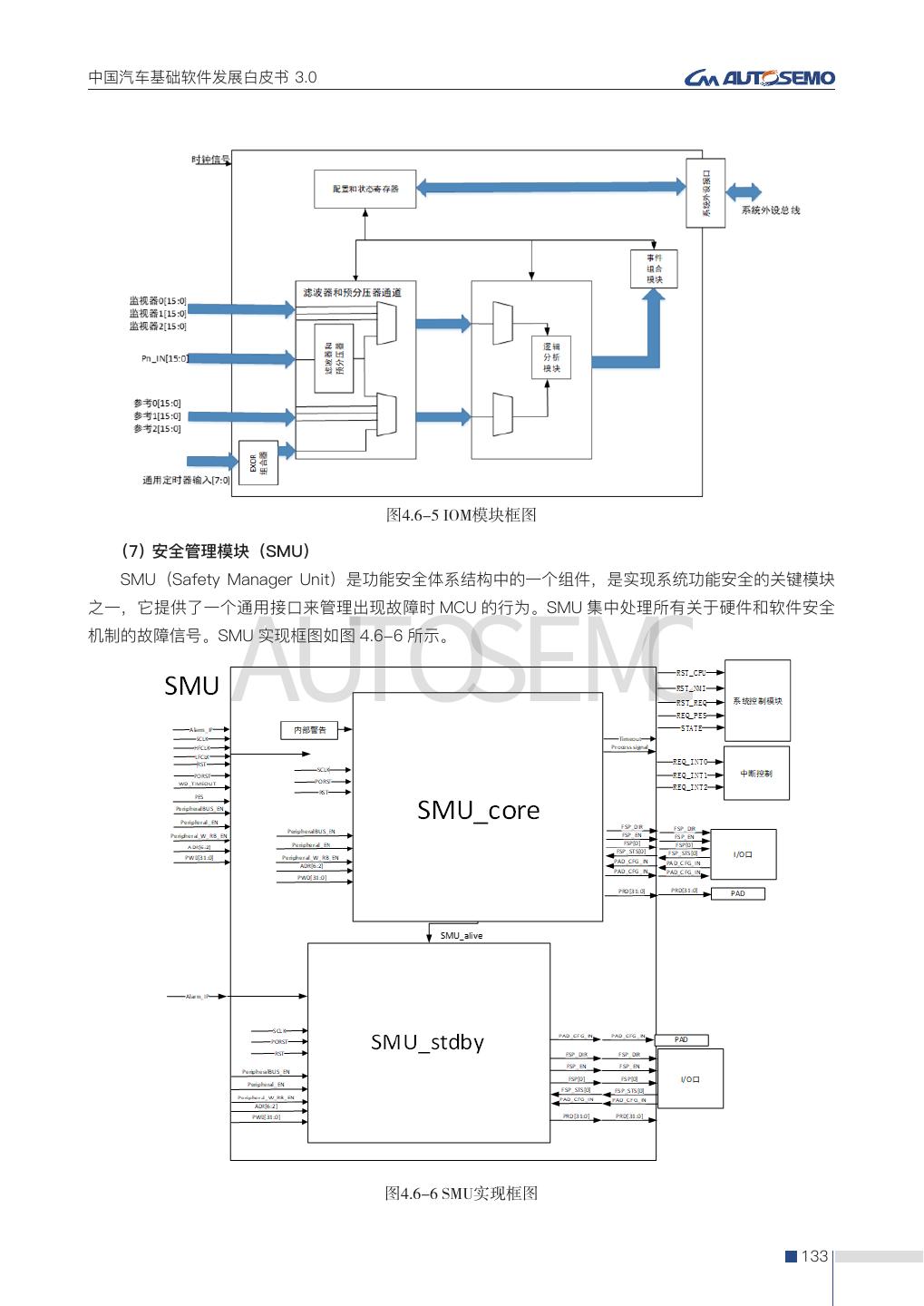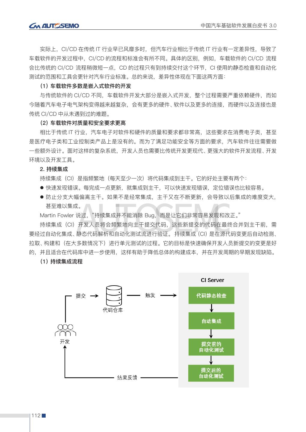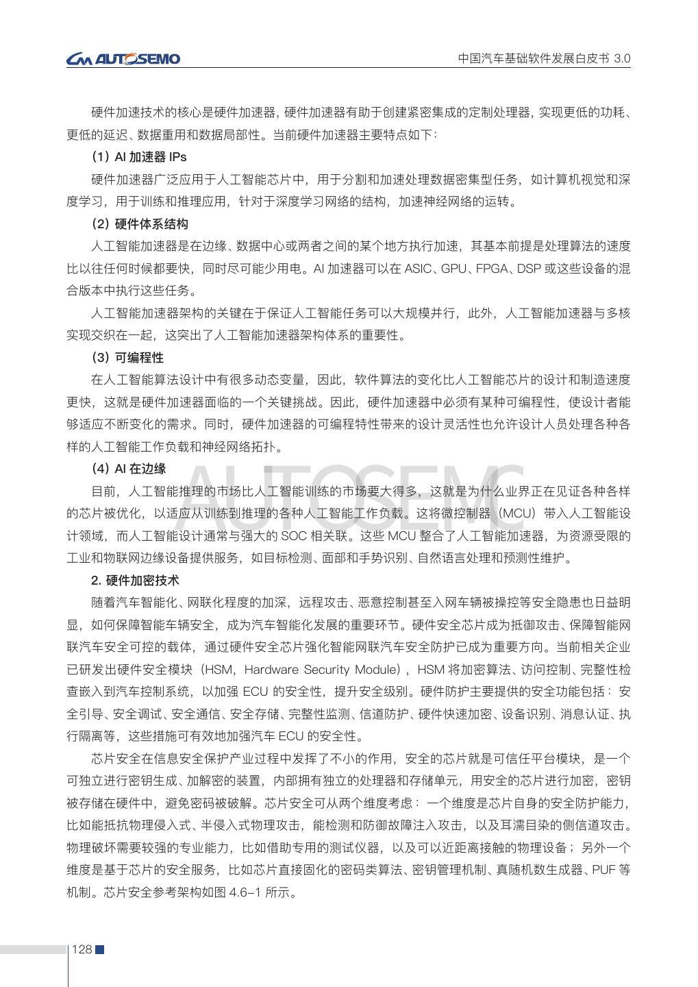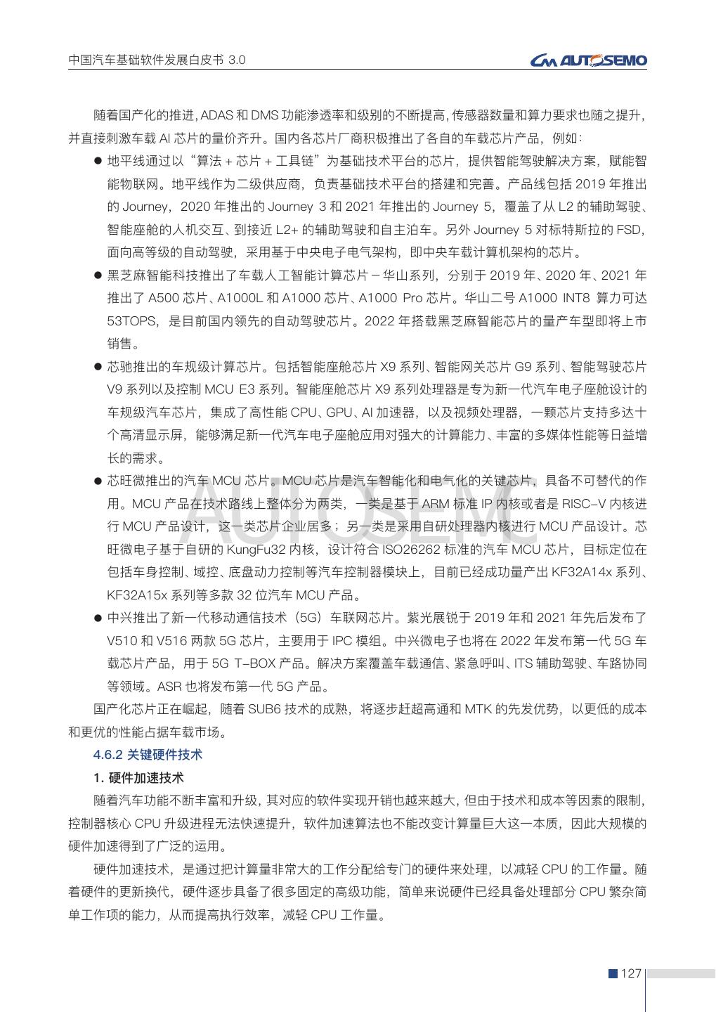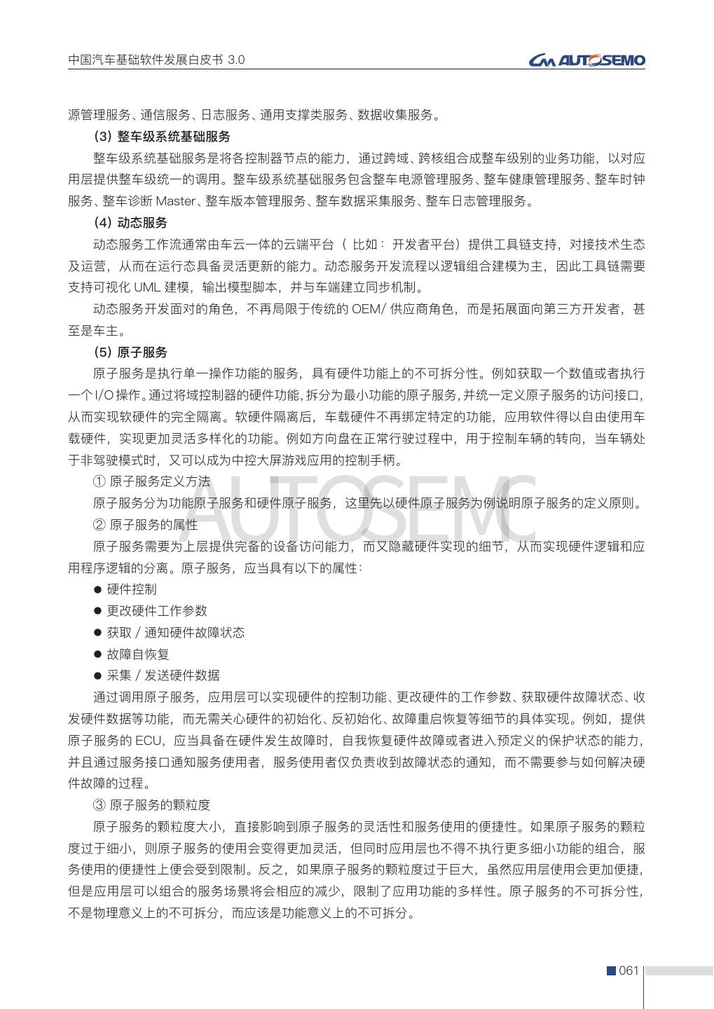 12 . 中国汽车基础软件发展白皮书 3.0 四个方面对基础软件开发平台的重要组成部分 CP AUTOSAR、AP AUTOSAR、操作系统内核、虚拟化进 行介绍。 第 3 章智能汽车车用基础软件平台分别介绍了基于功能软件的自动驾驶平台和基于 ASF (AU- TOSEMO Service Framework) 的生态框架,说明了其组成部分和适用场景。 第 4 章智能汽车车用基础软件开发平台关联技术以六个技术领域为切入点,分别研究了基础软件平 台对支撑功能安全所起的作用 ;研究了基础软件开发平台对支撑信息安全所起的作用 ;研究了边缘计算 如何更好地驾驭数据以支撑车企数字化转型 ;研究了双态开发模型和持续集成持续发布 CI/CD 如何支撑 基础软件开发平台的高效开发 ;研究了几种主流支撑 SOA 的先进车载通信技术 ;研究了车载芯片的发展 趋势及其关键技术。 第 5 章国产基础软件生态介绍描述了国产基础软件生态的发展现状。 第 6 章国产基础软件问题与展望对基础软件平台的未来发展提出了建议。 AUTOSEMO 006