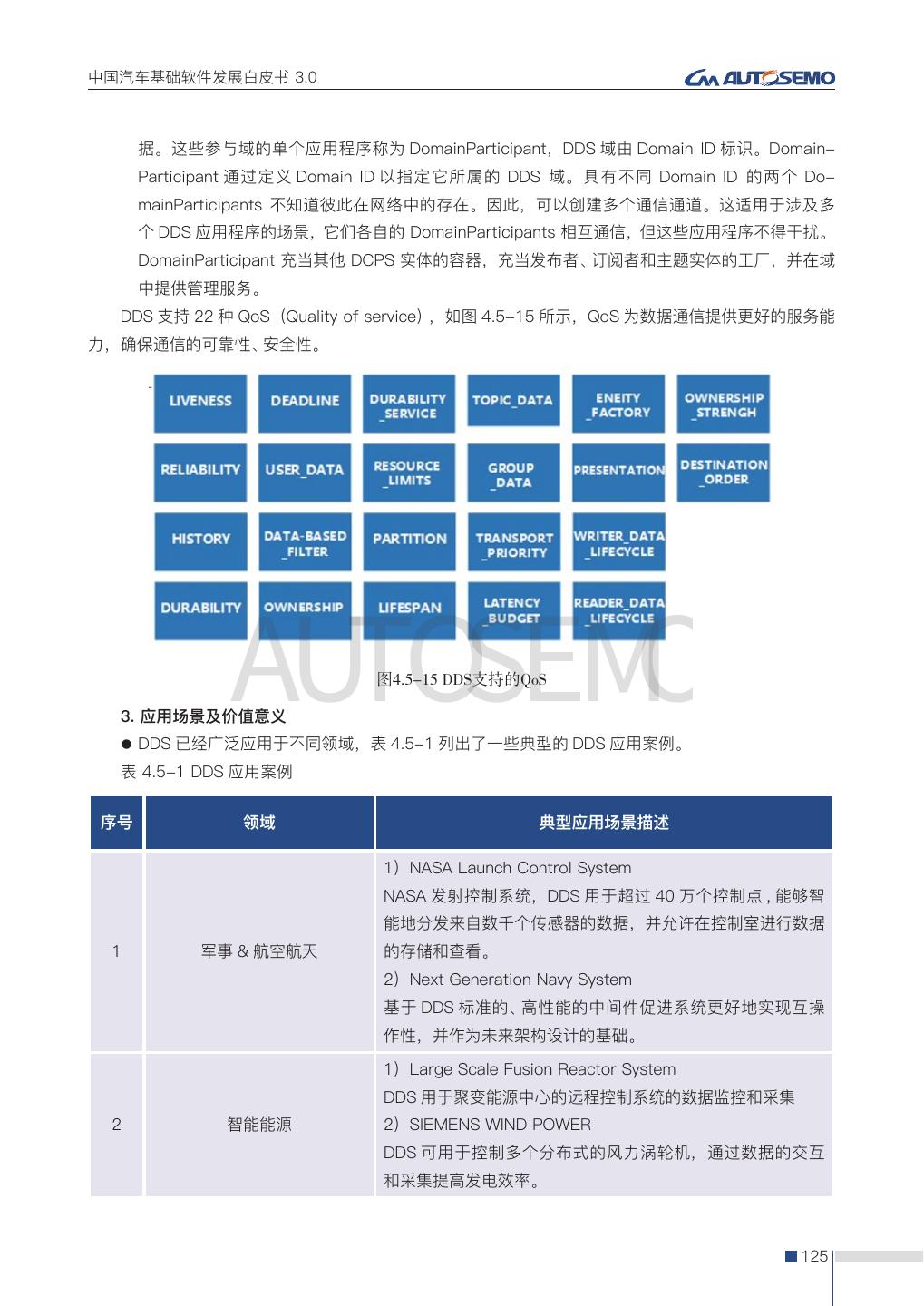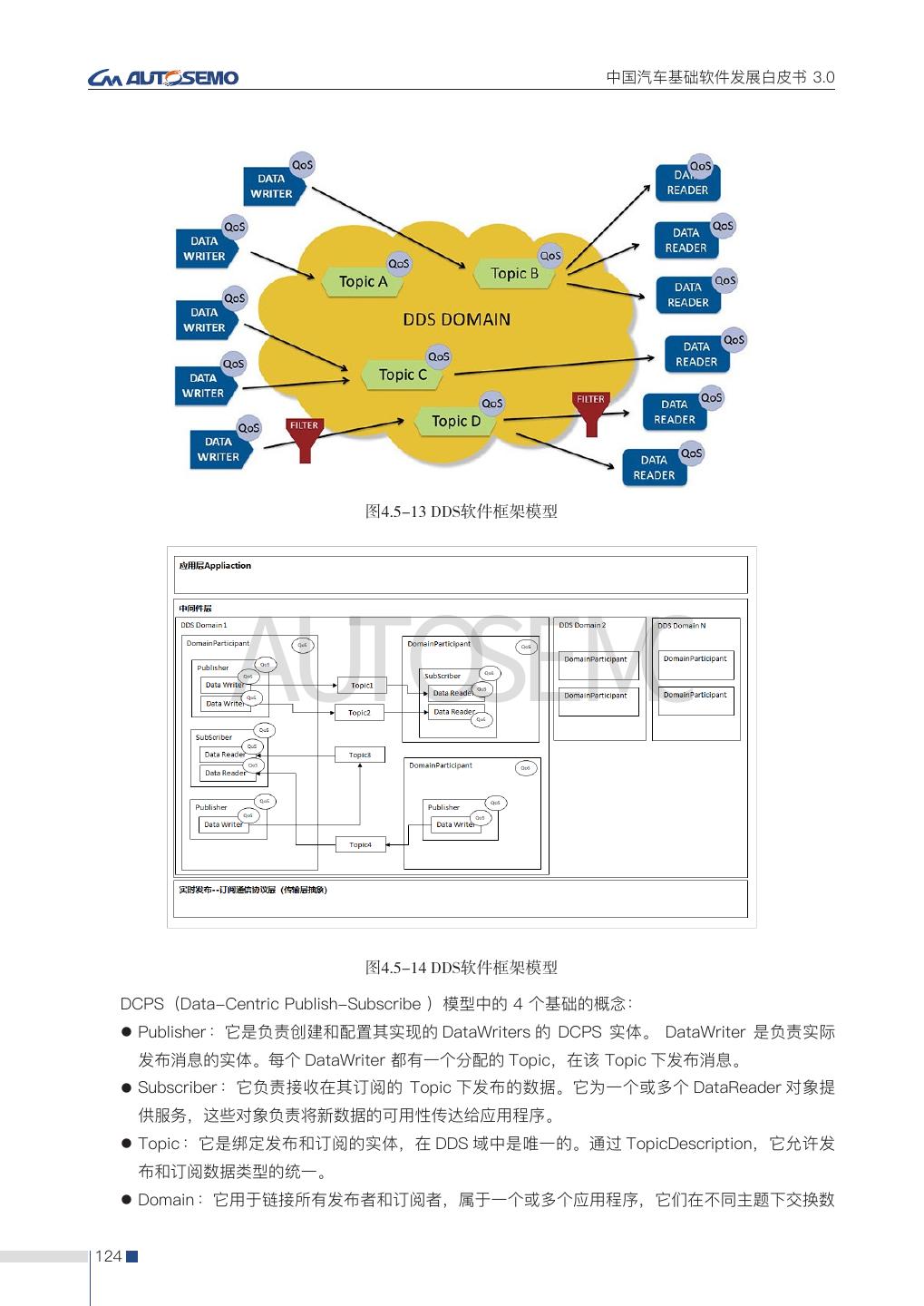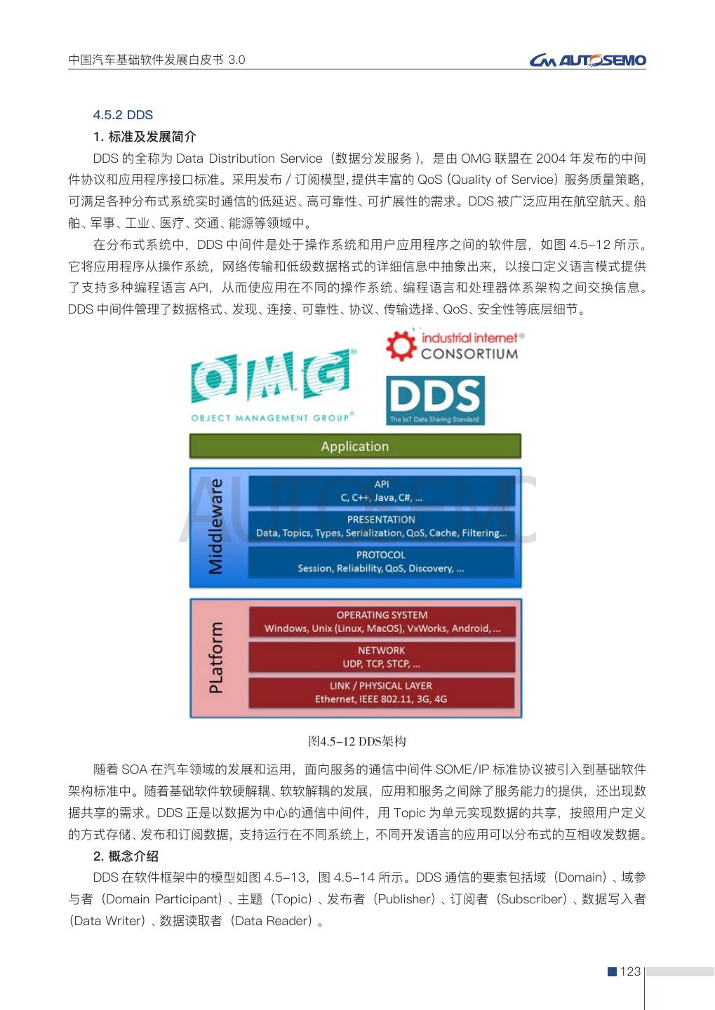 5 . 中国汽车基础软件发展白皮书 3.0 2.4 虚拟化��������������������������������������039 2.4.1 技术形态 ����������������������������������040 2.4.2 技术发展趋势��������������������������������041 2.4.3 关键技术解读 ��������������������������������044 2.4.4 典型应用案例��������������������������������048 第 3 章 智能汽车车用基础软件平台 3.1 基础软件开发平台���������������������������������052 3.1.1 基于功能软件的自动驾驶平台�������������������������052 3.1.2 基于 ASF 的生态框架�����������������������������057 3.2 基础软件验证平台���������������������������������062 3.2.1 验证平台概要��������������������������������062 3.2.2 验证平台典型案例������������������������������063 第 4 章 智能汽车车用基础软件平台关联技术 AUTOSEMO 4.1 功能安全与基础软件��������������������������������075 4.1.1 相关标准介绍��������������������������������075 4.1.2 功能安全软件架构������������������������������078 4.1.3 内存分区静态分析技术解读��������������������������083 4.1.4 工具链的功能安全要求����������������������������084 4.2 信息安全与基础软件��������������������������������086 4.2.1 相关标准介绍��������������������������������086 4.2.2 信息安全软件架构������������������������������089 4.2.3 关键技术解读��������������������������������090 4.3 数据管理与基础软件��������������������������������094 4.3.1 汽车数据智能背景介绍����������������������������094 4.3.2 基于边缘计算的嵌入式车端数据管理系统��������������������100 4.3.3 数据驱动能力分级������������������������������104 4.4 开发模型与基础软件��������������������������������105 4.4.1 双态敏捷开发模型������������������������������105 4.4.2 自动化编译框架�������������������������������108 4.4.3 持续集成持续交付������������������������������111 4.5 车载通信技术�����������������������������������115 4.5.1 SOME/IP����������������������������������115 4.5.2 DDS������������������������������������123 II