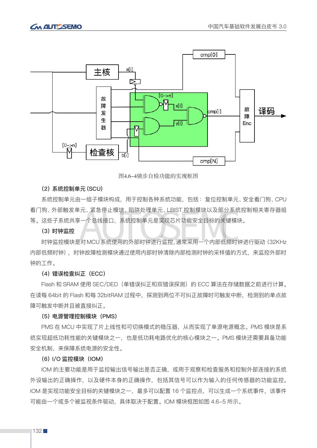 15 .中国汽车基础软件发展白皮书 3.0 AUTOSEMO 图 2.1-3 AUTOSAR CP软件分层架构 服务层提供了汽车嵌入式系统软件常用的一些服务,包括系统服务、存储服务以及通信服务三大部分。 还提供包括网络管理、存储管理、模式管理和实时操作系统等服务。ECU 抽象层与 ECU 平台相关,但与 微控制器无关,包括板级硬件抽象、存储硬件抽象、通信硬件抽象和 I/O 硬件抽象。该层将 ECU 结构进 行了抽象,负责提供统一的访问接口,实现对通信、存储器或者 I/O 的访问,从而不需要考虑这些资源 是由微控制器片内还是片外提供的。微控制器抽象层是实现不同硬件接口统一化的特殊层,包括微控制 器驱动、存储驱动、通信驱动以及 I/O 驱动。通过微控制器抽象层可将硬件封装起来,避免上层软件直接 对微控制器的寄存器进行操作。最后,由于对复杂传感器和执行器进行操作的模块涉及严格的时序问题, 难以抽象,所以在 AUTOSAR CP 规范中没有被标准化,统称为复杂驱动。 如上所述,AUTOSAR CP 良好的分层架构为软硬件之间解耦、软件模块之间解耦提供了坚实的保障。 3. 工具链 V 模型是目前汽车电子软件开发过程中采用的主流开发模式,V 模型左侧统称为设计阶段,主要涵 盖业务需求分析(Requirement Analysis)、系统设计(System Design)、架构设计(Architectural De- sign)、模块设计(Module Design)和编码(Coding)五个阶段。V 模型右侧统称为测试阶段,涵盖单元 测试(Unit Testing)、集成测试(Integration Testing)、系统测试(System Testing)和验收测试(Ac- ceptance Testing)四个阶段。在 V 模型左侧,当前主流商用工具链可以全面支撑 AUTOSAR CP 开发方 法论中提到的系统架构级、ECU 级和 SWC 级开发,详细请参考图 2.1-4 AUTOSAR CP 工具链。 009