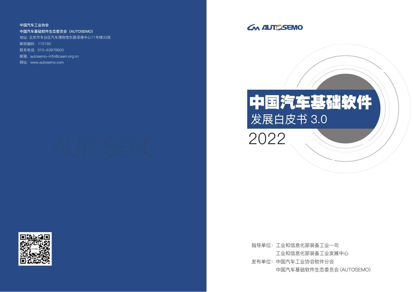 1 .中国汽车工业协会 中国汽车基础软件生态委员会(AUTOSEMO) 地址: 北京市丰台区汽车博物馆东路诺德中心11号楼33层 邮政编码:110160 联系电话: 010-63979900 邮箱: autosemo-info@caam.org.cn 网址: www.autosemo.com 中国汽车基础软件 发展白皮书 3.0 2022 指导单位:工业和信息化部装备工业一司 工业和信息化部装备工业发展中心 发布单位:中国汽车工业协会软件分会 中国汽车基础软件生态委员会 (AUTOSEMO)
