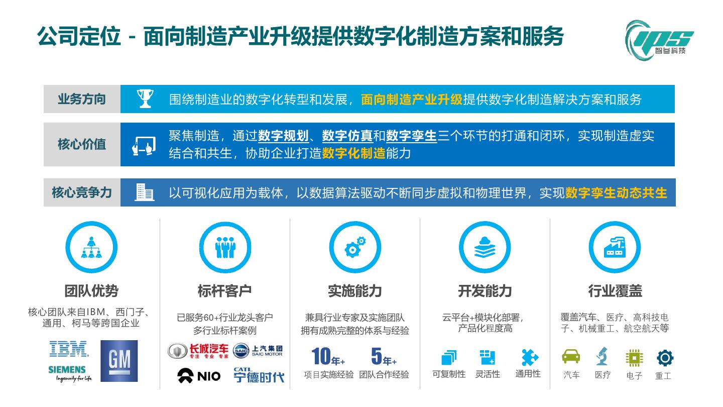 6 . 公司定位 - 面向制造产业升级提供数字化制造方案和服务 业务方向 围绕制造业的数字化转型和发展,面向制造产业升级提供数字化制造解决方案和服务 聚焦制造,通过数字规划、数字仿真和数字孪生三个环节的打通和闭环,实现制造虚实 核心价值 结合和共生,协助企业打造数字化制造能力 核心竞争力 以可视化应用为载体,以数据算法驱动不断同步虚拟和物理世界,实现数字孪生动态共生 团队优势 标杆客户 实施能力 开发能力 行业覆盖 核心团队来自IBM、西门子、 已服务60+行业龙头客户 兼具行业专家及实施团队 云平台+模块化部署, 覆盖汽车、医疗、高科技电 通用、柯马等跨国企业 多行业标杆案例 拥有成熟完整的体系与经验 产品化程度高 子、机械重工、航空航天等 10年+ 5年+ 项目实施经验 团队合作经验 可复制性 灵活性 通用性 汽车 医疗 电子 重工
