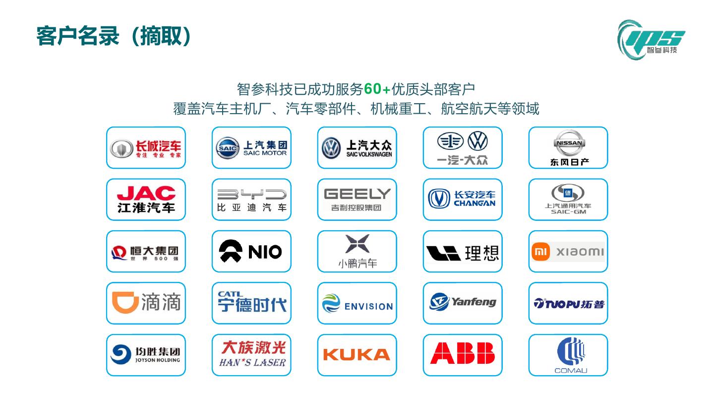8 .客户名录(摘取) 智参科技已成功服务 60+ 优质头部客户 覆盖汽车主机厂、汽车零部件、机械重工、航空航天等领域