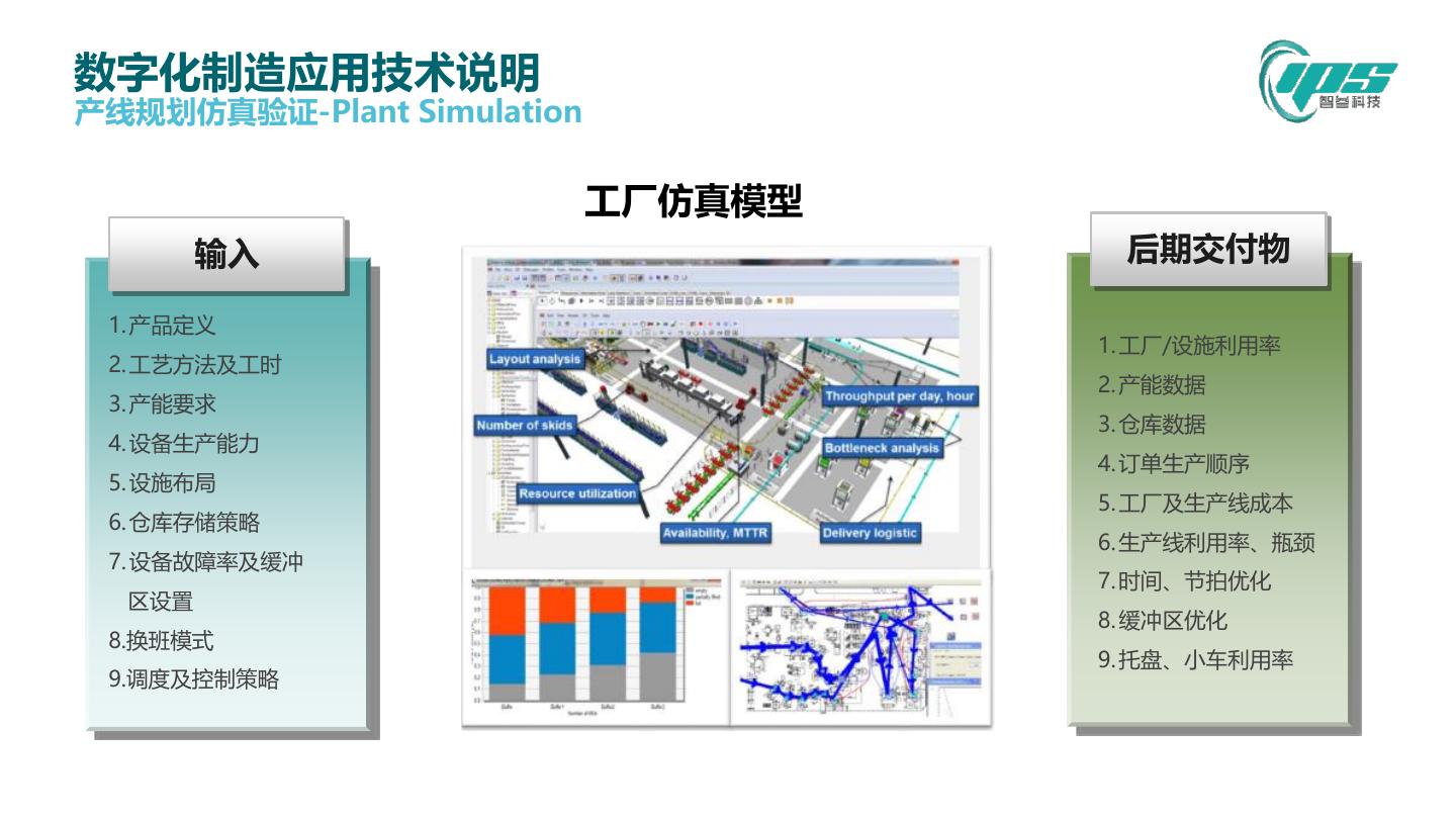 16 .数字化制造应用技术说明 3.产线规划仿真验证 业务挑战: 1. 产线规划阶段没有有效的方法进行产能和效率 仿真验证,造成产线实际与设计要求有偏差 2. 对于设备瓶颈的分析能力不足,产线的某些工 位有生产瓶颈或堆积 3. 只能靠经验评估产能,难以对应高低峰 工厂仿真应用特点: 工厂物流仿真案例(某锂电池生产工厂) 1. 生产与物流瓶颈检查与消除 2. 确定缓冲区大小,避免过多物料堆积或不足 1. 动态全方位评价多种方案 3. 依照订单高低峰随时产能评估与分析 的优劣性 4. 多个生产方案量化比较,找出最经济或产量 2. 仿真优化后的方案比初始 最优的方案 方案节省预算约200万( 设备采购与基建布置) 3. 确定不同方案下的物料流 策略,人力资源分配策略 4. 缓存区面积降低10%,平 均工位利用率提升 23.55%,产能提升 21.25%