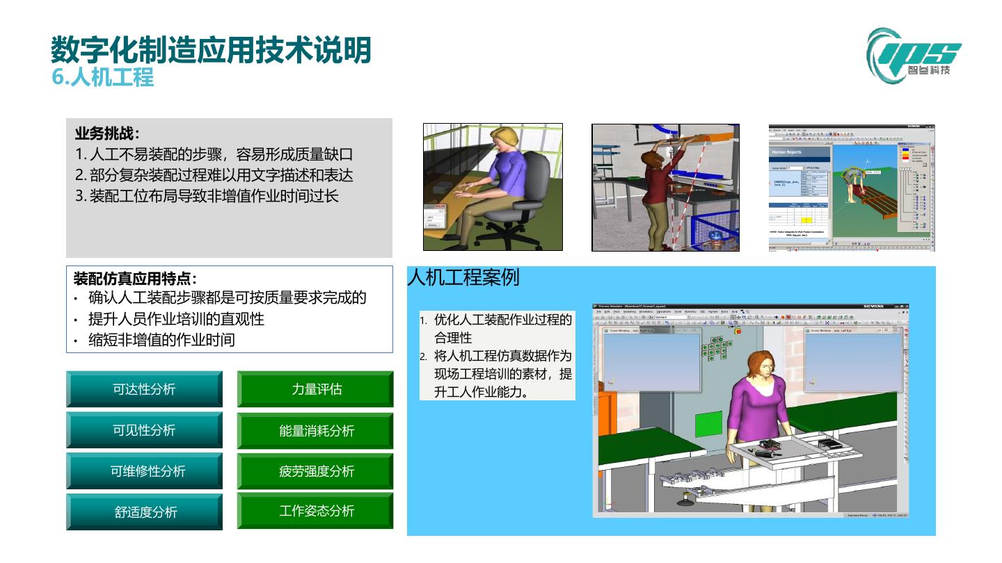 21 .数字化制造应用技术说明 6.人机工程 业务挑战: 1. 人工不易装配的步骤,容易形成质量缺口 2. 部分复杂装配过程难以用文字描述和表达 3. 装配工位布局导致非增值作业时间过长 装配仿真应用特点: 人机工程案例 • 确认人工装配步骤都是可按质量要求完成的 • 提升人员作业培训的直观性 1. 优化人工装配作业过程的 • 缩短非增值的作业时间 合理性 2. 将人机工程仿真数据作为 现场工程培训的素材,提 可达性分析 力量评估 升工人作业能力。 可见性分析 能量消耗分析 可维修性分析 疲劳强度分析 舒适度分析 工作姿态分析