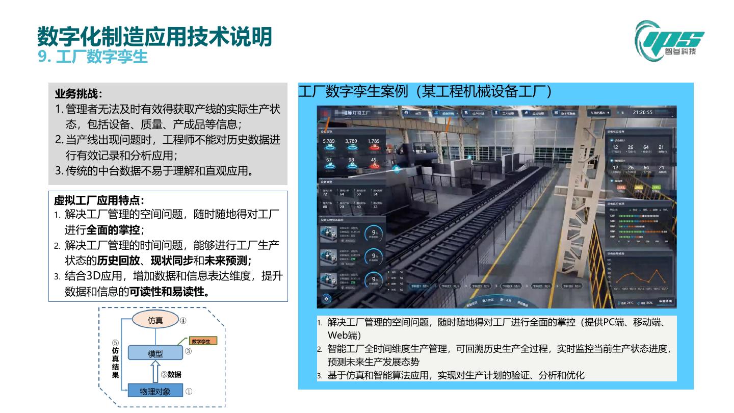 7 .IPS基于数字孪生的数字化制造核心技术(数字化工厂) 算法&仿真分析 可视化展示 一体化 应用 数 据 工 中 业 心 大 数 数 据 据 来 源