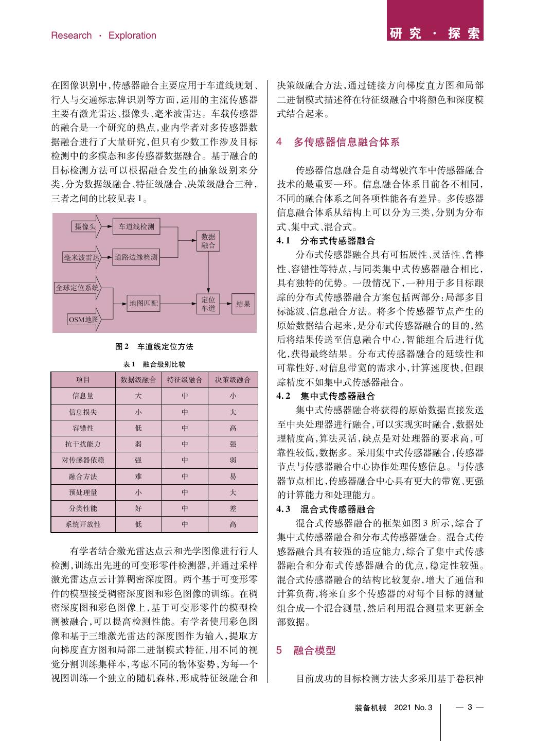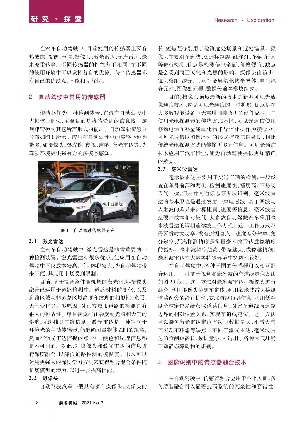 2 .研 究 · 探 索 Res ear ch· Ex plor ati on 在汽车自动驾驶中,目前使用的传感器主要有 长、 短焦距分别用于检测远处场景和近处场景。摄 热成像、夜视、声呐、摄像头、激光雷达、超声雷达、毫 像头主要对车道线、交通标志牌、红绿灯、车辆、行人 米波雷达等。不同传感器的性能各不相同,在不同 等进行检测,优点是检测信息全面、价格便宜,缺点 的使用环境中可以发挥各自的优势。每个传感器都 是会受到雨雪天气和光照的影响。摄像头由镜头、 有自己的优缺点,不能相互替代。 镜头模组、滤光片、互补金属氧化物半导体、电荷耦 合元件、图像处理器、数据传输等模块组成。 2 自动驾驶中常用的传感器 目前,摄像头领域最新的技术是新型可见光成 像通信技术,这是可见光通信的一种扩展,优点是在 传感器作为一种检测装置,在汽车自动驾驶中 大多数智能设备中无需增加接收机的硬件成本。与 占据核心地位,主要目的是将感受到的信息按一定 使用光电探测器的传统方式不同,可见光通信使用 规律转换为其它所需形式的输出。自动驾驶传感器 移动电话互补金属氧化物半导体相机作为接收器。 分布如图 1所示。应用在自动驾驶中的传感器种类 可见光通信以图像序列的形式捕获二维数据,相比 繁多,如摄像头、热成像、夜视、声呐、激光雷达等,为 传统光电探测方式能传输更多的信息。可见光通信 驾驶环境提供强有力的多模态感知。 技术应用于汽车行业,能为自动驾驶提供更加精确 的数据。 2. 3 毫米波雷达 毫米波雷达主要用于交通车辆的检测,一般设 置在车身前部和两侧,检测速度快,精度高,不易受 天气干扰,但是对交通标志等无法识别。毫米波雷 达的基本原理是通过发射一束电磁波,基于回波与 入射波的差异来计算距离、速度等信息。毫米波雷 达硬件成本相对较低,大多数自动驾驶汽车采用毫 米波雷达的调频连续波工作方式。这一工作方式不 图 1 自动驾驶传感器分布 需要瞬时大功率,没有探测盲点。速度差分辨率、角 2. 1 激光雷达 分辨率、距离探测精度是衡量毫米波雷达成像精度 在汽车自动驾驶中,激光雷达是非常重要的一 的指标。毫米波频率越高,带宽越大,成像越精细。 种检测装置。激光雷达有很多优点,但应用在自动 毫米波雷达在大雾等特殊环境中穿透性较好。 驾驶中不仅成本较高,而且体积较大,为自动驾驶带 在自动驾驶中,各种不同的传感器可以相互配 来不便,其应用市场受到限制。 合运用。一种基于视觉和毫米波的车道线定位方法 目前,基于混合条件随机场的激光雷达 摄像头 如图 2所示。这一方法对毫米波雷达和摄像头进行 融合已运用于道路检测中。道路材料的变化,以及 融合,利用摄像头检测车道线,利用毫米波雷达检测 道路区域与非道路区域高度和纹理的相似性、光照、 道路两旁的静止护栏,获取道路边界信息,利用低精 天气变化等诸多原因,对正常城市道路的检测具有 度全球定位系统获取道路信息,对比车道线与道路 很大的挑战性。单目视觉往往会受到光照和天气的 边界的相对位置关系,实现车道线定位。这一方法 影响,无法捕捉三维信息。激光雷达是一种独立于 可以避免激光雷达定位方法中数据量大、雨雪天气 环境光的主动传感器,能准确测量物体之间的距离, 下表现不理想等缺点。不同于激光雷达,毫米波雷 然而在激光雷达捕捉的点云中,颜色和纹理信息都 达的检测距离长、数据量小,可适用于各种天气环境 是不可用的。对此,对摄像头和激光雷达的信息进 下动静态障碍物的识别。 行深度融合,以降低道路检测的模糊度。未来可以 运用更强大的深度学习方法来获得融合混合条件随 3 图像识别中的传感器融合技术 机场模型的潜力,以进一步提高性能。 2. 2 摄像头 在自动驾驶中,传感器融合应用于各个方面,多 自动驾驶汽车一般具有多个摄像头,摄像头的 传感器融合可以显著提高系统的冗余性和容错性。 — 2— 装备机械 2021No. 3