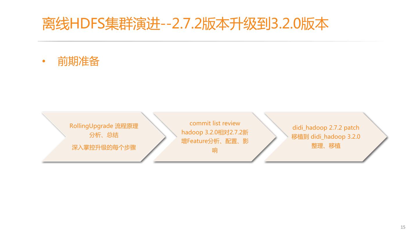 14 .离线HDFS集群演进--2.7.2版本升级到3.2.0版本 • 升级规划 小集群优先升级, 主集群逐步稳定 前期准备 测试 持续观察服务 升级 14