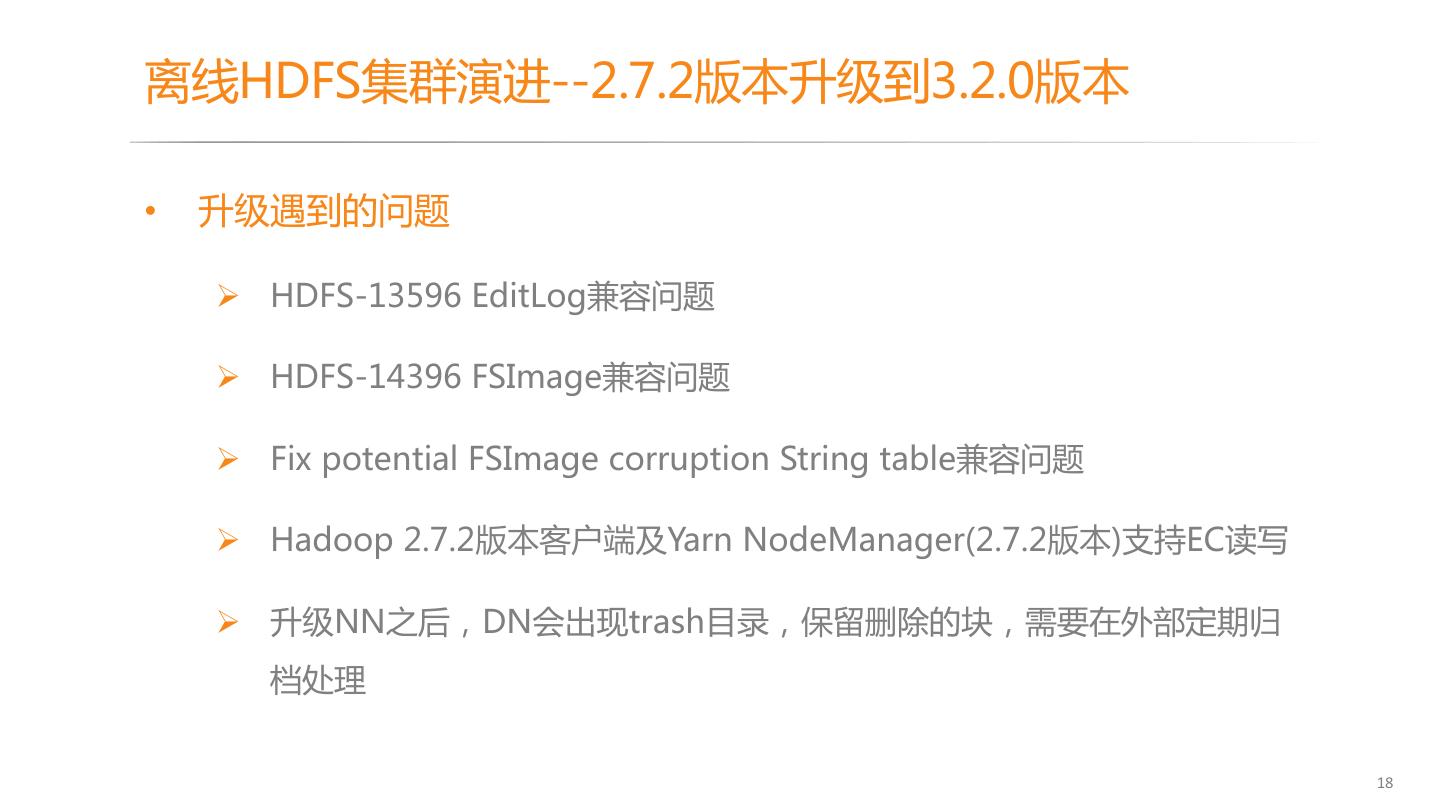17 .离线HDFS集群演进--2.7.2版本升级到3.2.0版本 • 升级节奏 小集群 主集群 • 滚动升2.7.2->3.2.0 • 滚动升级2.7.2->3.2.0 备份集群 • 滚动升级3.1.1- >3.2.0 17
