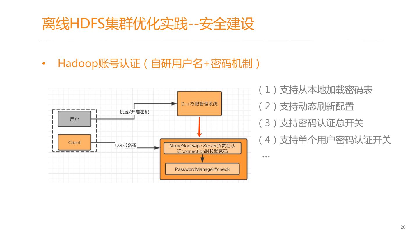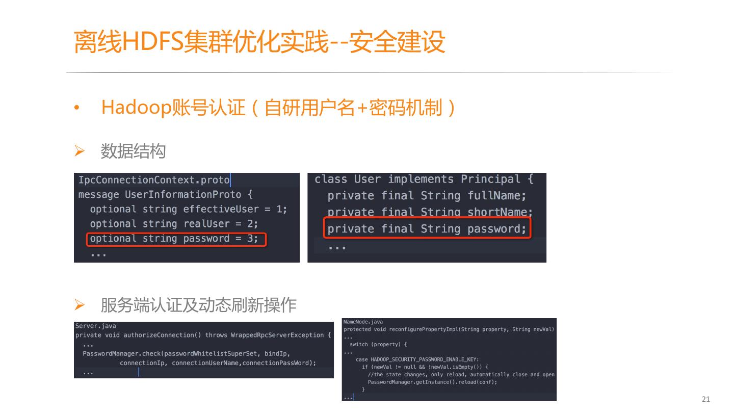 20 .离线HDFS集群优化实践--安全建设 • Hadoop账号认证(自研用户名+密码机制) (1)支持从本地加载密码表 (2)支持动态刷新配置 (3)支持密码认证总开关 (4)支持单个用户密码认证开关 … 20