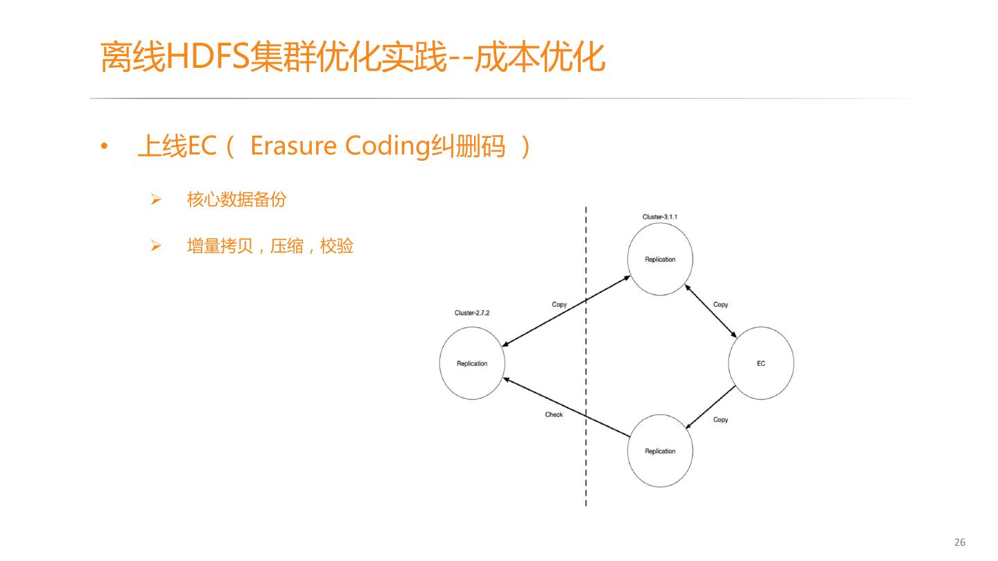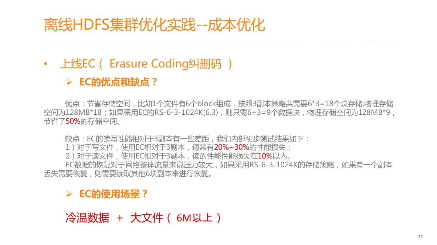 26 .离线HDFS集群优化实践--成本优化 • 上线EC( Erasure Coding纠删码 ) Ø 核心数据备份 Ø 增量拷贝,压缩,校验 26