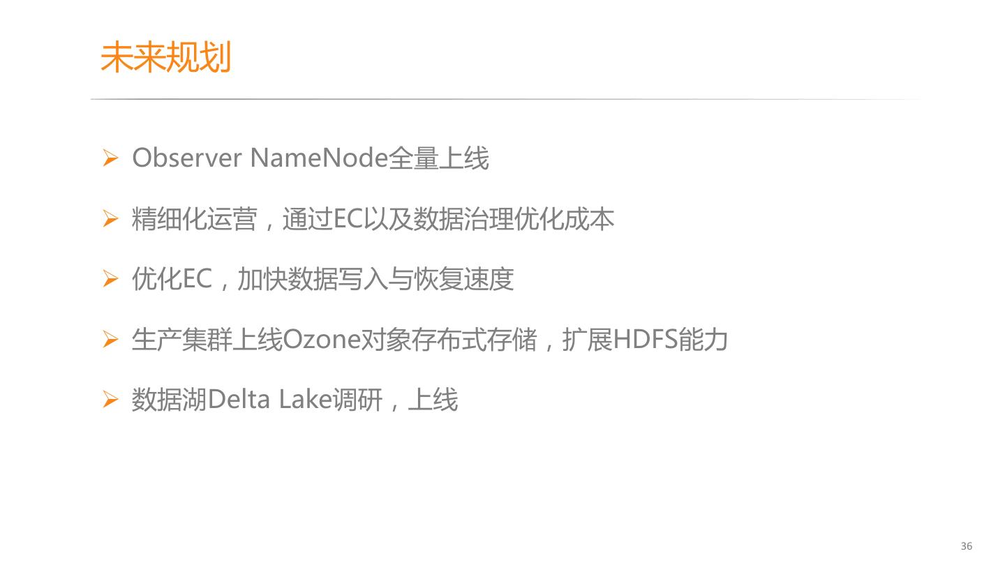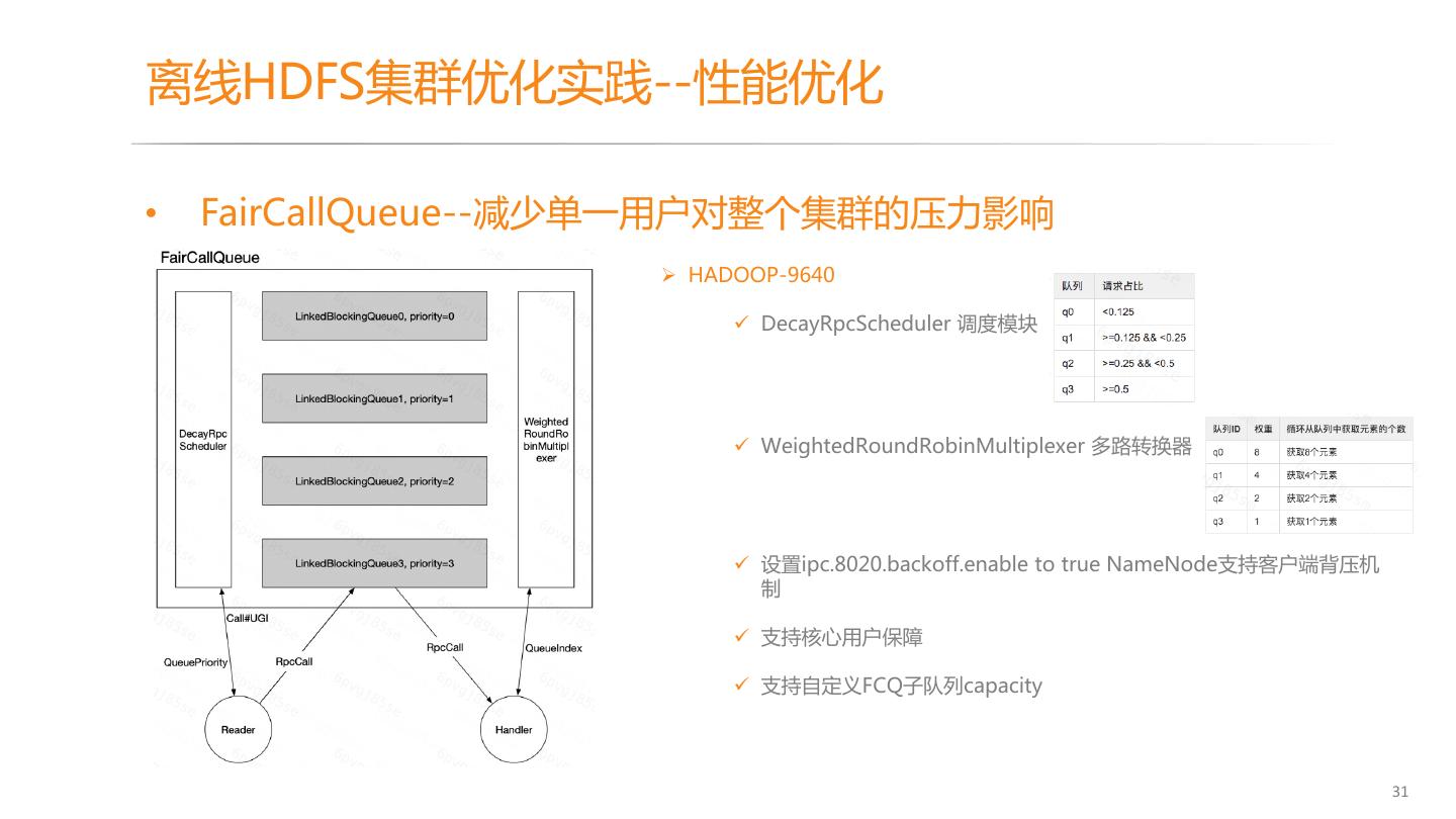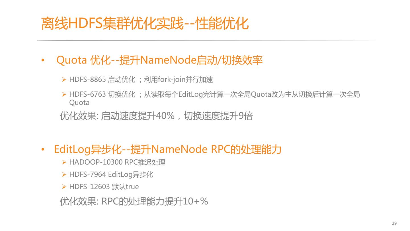 29 .离线HDFS集群优化实践--性能优化 • Quota 优化--提升NameNode启动/切换效率 Ø HDFS-8865 启动优化 ;利用fork-join并行加速 Ø HDFS-6763 切换优化 ;从读取每个EditLog完计算一次全局Quota改为主从切换后计算一次全局 Quota 优化效果: 启动速度提升40%,切换速度提升9倍 • EditLog异步化--提升NameNode RPC的处理能力 Ø HADOOP-10300 RPC推迟处理 Ø HDFS-7964 EditLog异步化 Ø HDFS-12603 默认true 优化效果: RPC的处理能力提升10+% 29