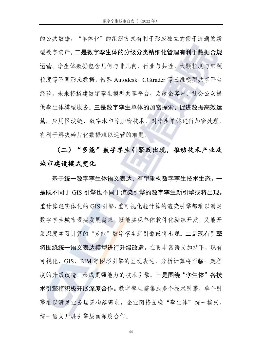 4 .转型内涵加快“演进”,政策措施“全面”,供给主体“丰富”、产 业赛道“扩展”、生态耦合“紧密”、应用门槛“降低”、学术研究 “活跃”、领域标准“深入”等发展态势。但数字孪生城市建设探索 过程中,也初步浮现出“有表无里”“有静无动”以及供给侧同质化 低质化、整体设计体系化不足等问题。 二是实施建议篇,白皮书首次深入分析数字孪生城市实施路径, 重点围绕总体架构更新演进、总体设计统筹推进、典型场景筛选解剖、 数字孪生体数据重构、能力引擎重组、可持续运营、成熟度评估等七 方面内容展开。提出以“对象实体孪生+业务流程孪生”构建城市孪 生体,以城市孪生体为基础,实现物联感知、全要素表达、可视化呈 现、数据融合供给、空间分析计算、模拟仿真推演、虚实交互、自学 习自优化、众创扩展等九大能力目标,构建城市级数字孪生新引擎以 及底座平台。 三是建设展望篇,在中国式现代化、国家治理能力与治理体系现 代化总体要求下,各地将因地制宜、深入开展数字孪生城市的实施探 索。短期看,数字孪生体“多源”数据融合重组,数字孪生“多能” 新引擎构建,数字孪生“多跨”场景实现将是近期发展重点。中长期 看,数字孪生体有望突破数字资产运营难题,孪生新引擎将全面激发 城市数字化创新活力,城市建设的数字孪生应用成果有望在千行百业 中推广借鉴。