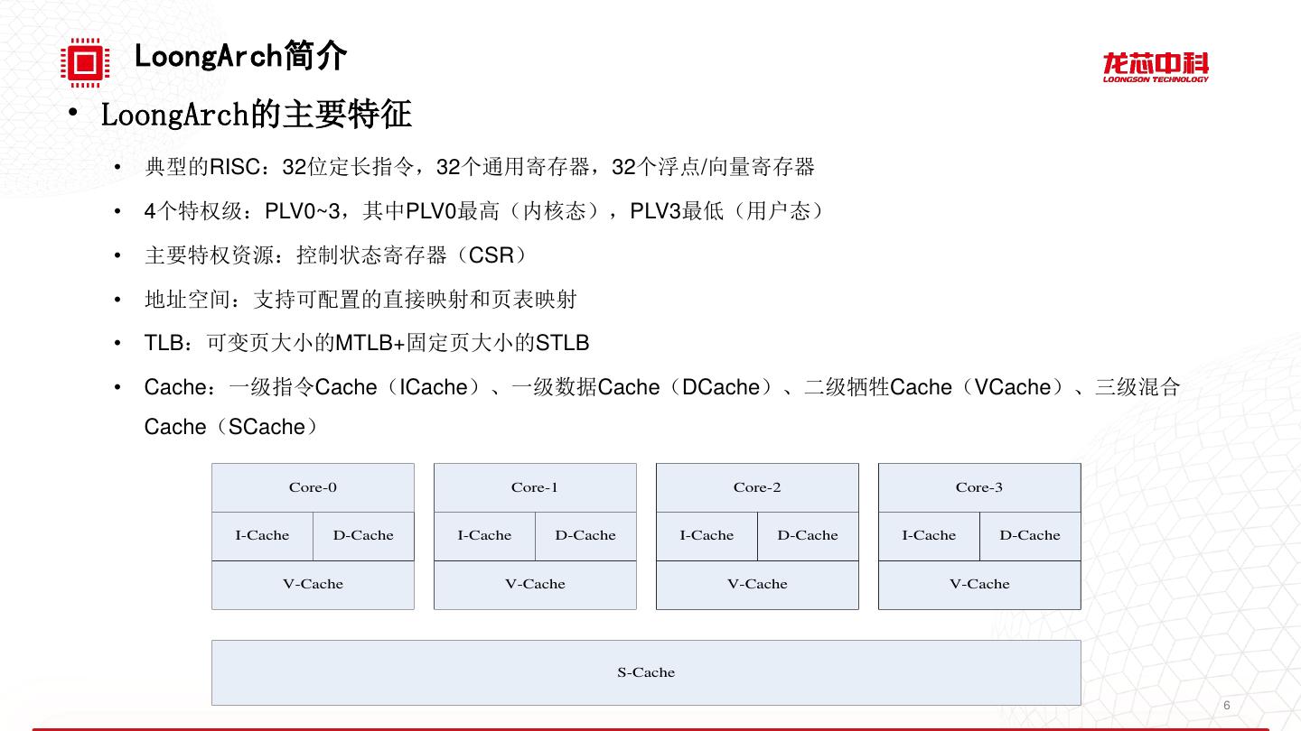 5 . LoongArch简介 • 龙芯处理器三大家族 • 龙芯1号 • 32位单核CPU(小CPU) • MIPS32指令集或LA32指令集 • 主要面向工业控制、数据采集、消费电子等 • 龙芯2号 • 低端64位单核/双核CPU(中CPU) • MIPS64指令集或LA64指令集(龙芯2K500/2K1000/2K2000) • 主要面向工业控制、移动终端、嵌入式计算机等 • 龙芯3号 • 高端64位多核CPU(大CPU) • MIPS64指令集(龙芯3A1000/3B1500/3A2000/3A3000/3A4000)或LA64指令集 (龙芯3A5000/3C5000/3D5000) • 主要面向电脑(桌面计算机、服务器、高性能计算机)等 5