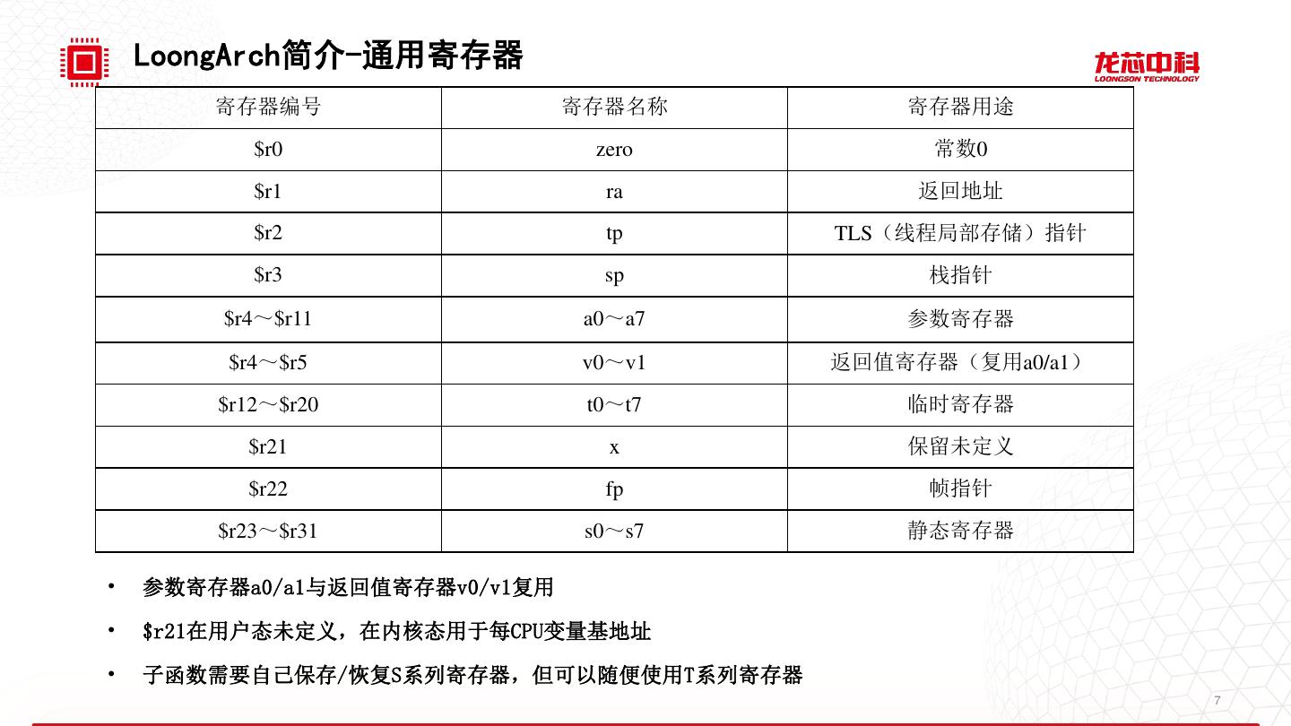 6 . LoongArch简介 • LoongArch的主要特征 • 典型的RISC:32位定长指令,32个通用寄存器,32个浮点/向量寄存器 • 4个特权级:PLV0~3,其中PLV0最高(内核态),PLV3最低(用户态) • 主要特权资源:控制状态寄存器(CSR) • 地址空间:支持可配置的直接映射和页表映射 • TLB:可变页大小的MTLB+固定页大小的STLB • Cache:一级指令Cache(ICache)、一级数据Cache(DCache)、二级牺牲Cache(VCache)、三级混合 Cache(SCache) Core-0 Core-1 Core-2 Core-3 I-Cache D-Cache I-Cache D-Cache I-Cache D-Cache I-Cache D-Cache V-Cache V-Cache V-Cache V-Cache S-Cache 6