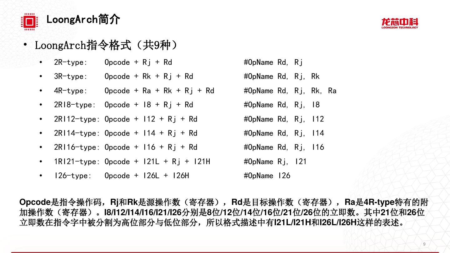 9 . LoongArch简介 • LoongArch指令格式(共9种) • 2R-type: Opcode + Rj + Rd #OpName Rd, Rj • 3R-type: Opcode + Rk + Rj + Rd #OpName Rd, Rj, Rk • 4R-type: Opcode + Ra + Rk + Rj + Rd #OpName Rd, Rj, Rk, Ra • 2RI8-type: Opcode + I8 + Rj + Rd #OpName Rd, Rj, I8 • 2RI12-type: Opcode + I12 + Rj + Rd #OpName Rd, Rj, I12 • 2RI14-type: Opcode + I14 + Rj + Rd #OpName Rd, Rj, I14 • 2RI16-type: Opcode + I16 + Rj + Rd #OpName Rd, Rj, I16 • 1RI21-type: Opcode + I21L + Rj + I21H #OpName Rj, I21 • I26-type: Opcode + I26L + I26H #OpName I26 Opcode是指令操作码,Rj和Rk是源操作数(寄存器),Rd是目标操作数(寄存器),Ra是4R-type特有的附 加操作数(寄存器)。I8/I12/I14/I16/I21/I26分别是8位/12位/14位/16位/21位/26位的立即数。其中21位和26位 立即数在指令字中被分割为高位部分与低位部分,所以格式描述中有I21L/I21H和I26L/I26H这样的表述。 9