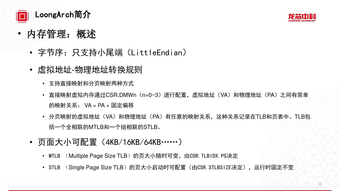 10 . LoongArch简介 • 内存管理:概述 • 字节序:只支持小尾端(LittleEndian) • 虚拟地址-物理地址转换规则 • 支持直接映射和分页映射两种方式 • 直接映射虚拟内存通过CSR.DMWn(n=0~3)进行配置,虚拟地址(VA)和物理地址(PA)之间有简单 的映射关系: VA = PA + 固定偏移 • 分页映射的虚拟地址(VA)和物理地址(PA)有任意的映射关系,这种关系记录在TLB和页表中。TLB包 括一个全相联的MTLB和一个组相联的STLB。 • 页面大小可配置(4KB/16KB/64KB……) • MTLB (Multiple Page Size TLB)的页大小随时可变,由CSR.TLBIDX.PS决定 • STLB (Single Page Size TLB)的页大小启动时可配置(由CSR.STLBSIZE决定),运行时固定不变 10