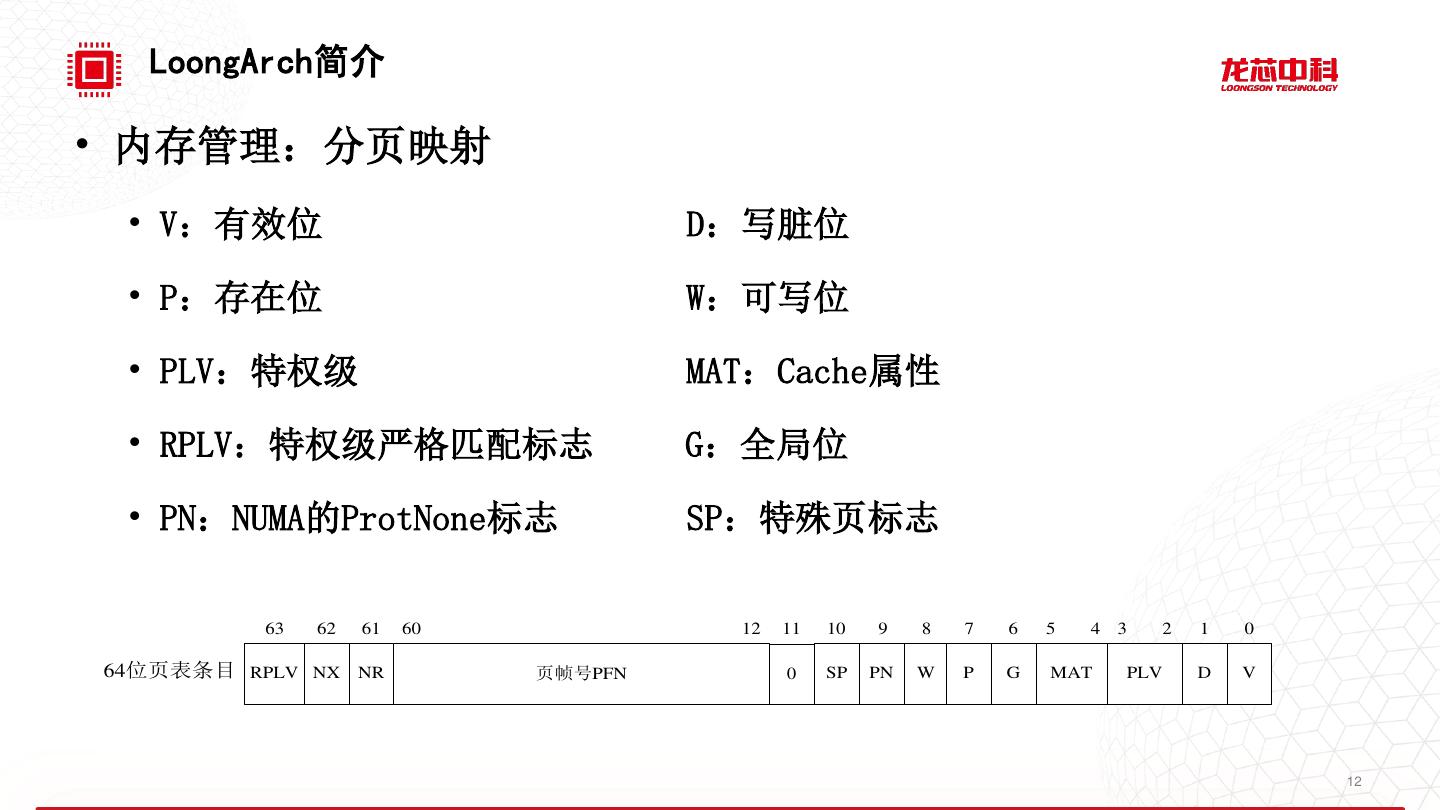 11 . LoongArch简介 • 内存管理:直接映射 KVRANGE (11) XKVRANGE (11) 0xC0000000 KPRANGE0/1 • MAT:内存访问类型(Cache属性) 0xC000000000000000 (10) 0x80000000 XKPRANGE • MAT=00:强序非缓存 (10) 0x40000000 UVRANGE 0x8000000000000000 • MAT=01:一致可缓存 (00/01) XSPRANGE (01) • MAT=10:弱序非缓存 0x00000000 0x4000000000000000 • MAT=11:保留未使用 左为32位地址空间 XUVRANGE (00) 右为64位地址空间 0x0000000000000000 63 62 61 60 59 0 前缀 64位线性地址 MAT 有效虚拟地址VA (10) 11