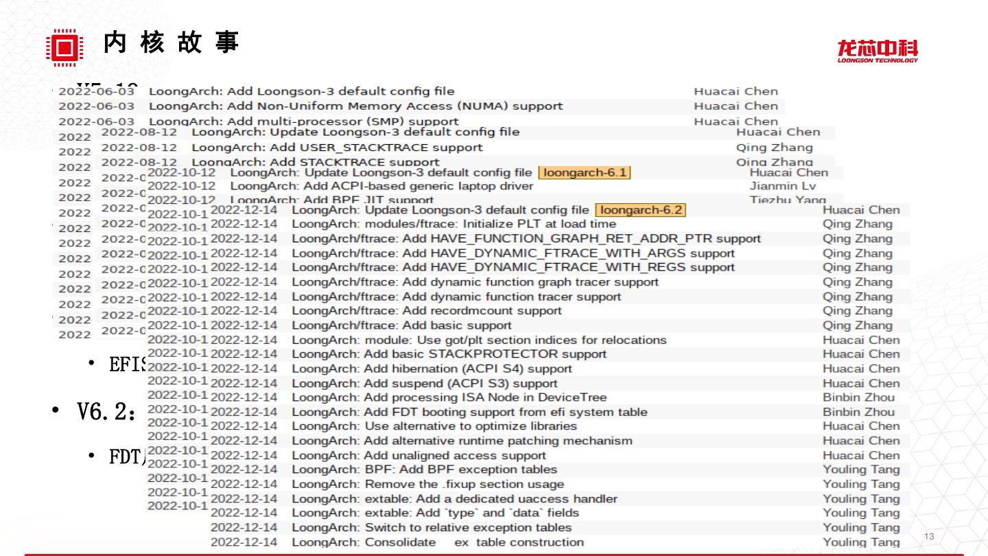 13 . 内 核 故 事 • V5.19: • LoongArch体系结构主体部分于进入上游 • 2万1千行代码,历时20个月,迭代15个版本 • V6.0: • 中断控制器驱动、PCI控制器驱动和VDSO优化进入上游 • V6.1: • EFISTUB启动、Qspinlock、PerfEvents、Kexec/Kdump、BPF JIT等功能进入上游 • V6.2: • FDT启动、挂起(S3,Suspend)、休眠(S4,Hibernation)、Ftrace 等功能进入上游 13