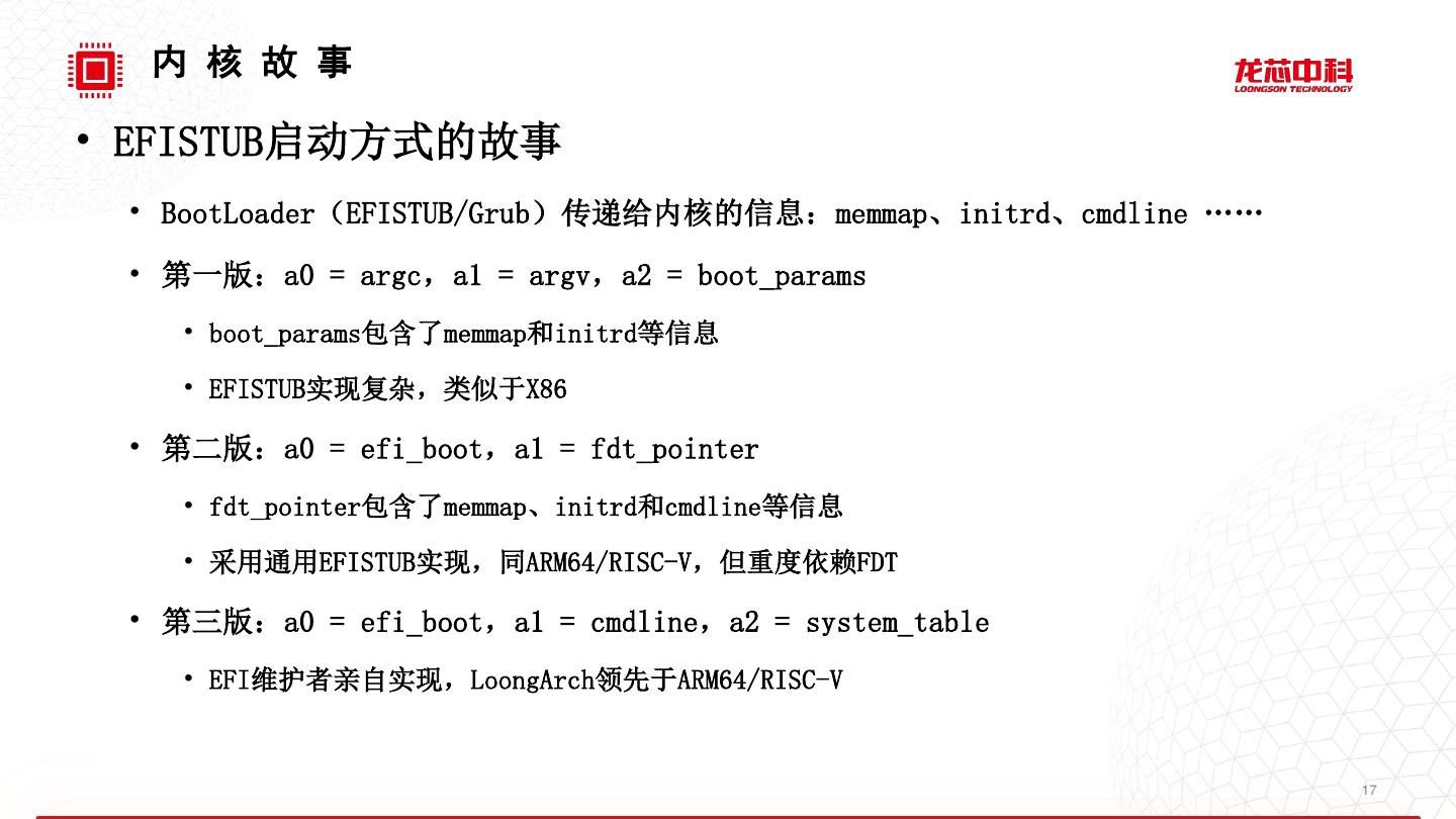 17 . 内 核 故 事 • EFISTUB启动方式的故事 • BootLoader(EFISTUB/Grub)传递给内核的信息:memmap、initrd、cmdline …… • 第一版:a0 = argc,a1 = argv,a2 = boot_params • boot_params包含了memmap和initrd等信息 • EFISTUB实现复杂,类似于X86 • 第二版:a0 = efi_boot,a1 = fdt_pointer • fdt_pointer包含了memmap、initrd和cmdline等信息 • 采用通用EFISTUB实现,同ARM64/RISC-V,但重度依赖FDT • 第三版:a0 = efi_boot,a1 = cmdline,a2 = system_table • EFI维护者亲自实现,LoongArch领先于ARM64/RISC-V 17