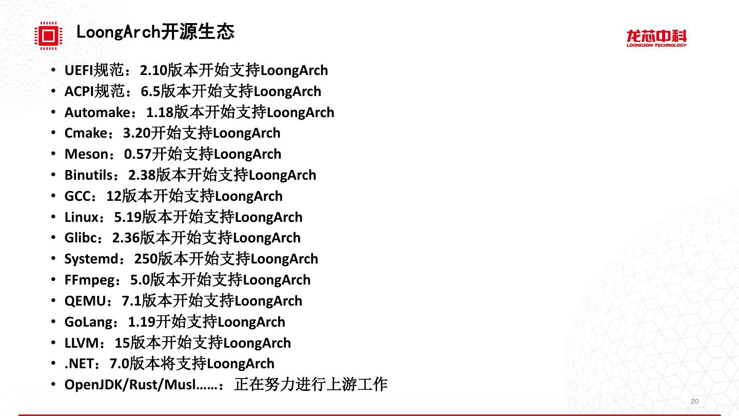 19 .未 来 展 望 • 基本功能 • 重定位内核(PIE)、向量、虚拟化、二进制翻译 …… • 电源管理 • 动态调频(CPUFreq,DVFS)、温度调控…… • 调测工具 • Kprobe/Uprobe、WatchPoint、kgdb …… • 更多处理器支持 • 目前仅支持大CPU:龙芯3A5000/3C5000/3D5000,使用ACPI • 未来要支持小CPU:龙芯1X/2K500/2K1000/2K2000,使用FDT 19