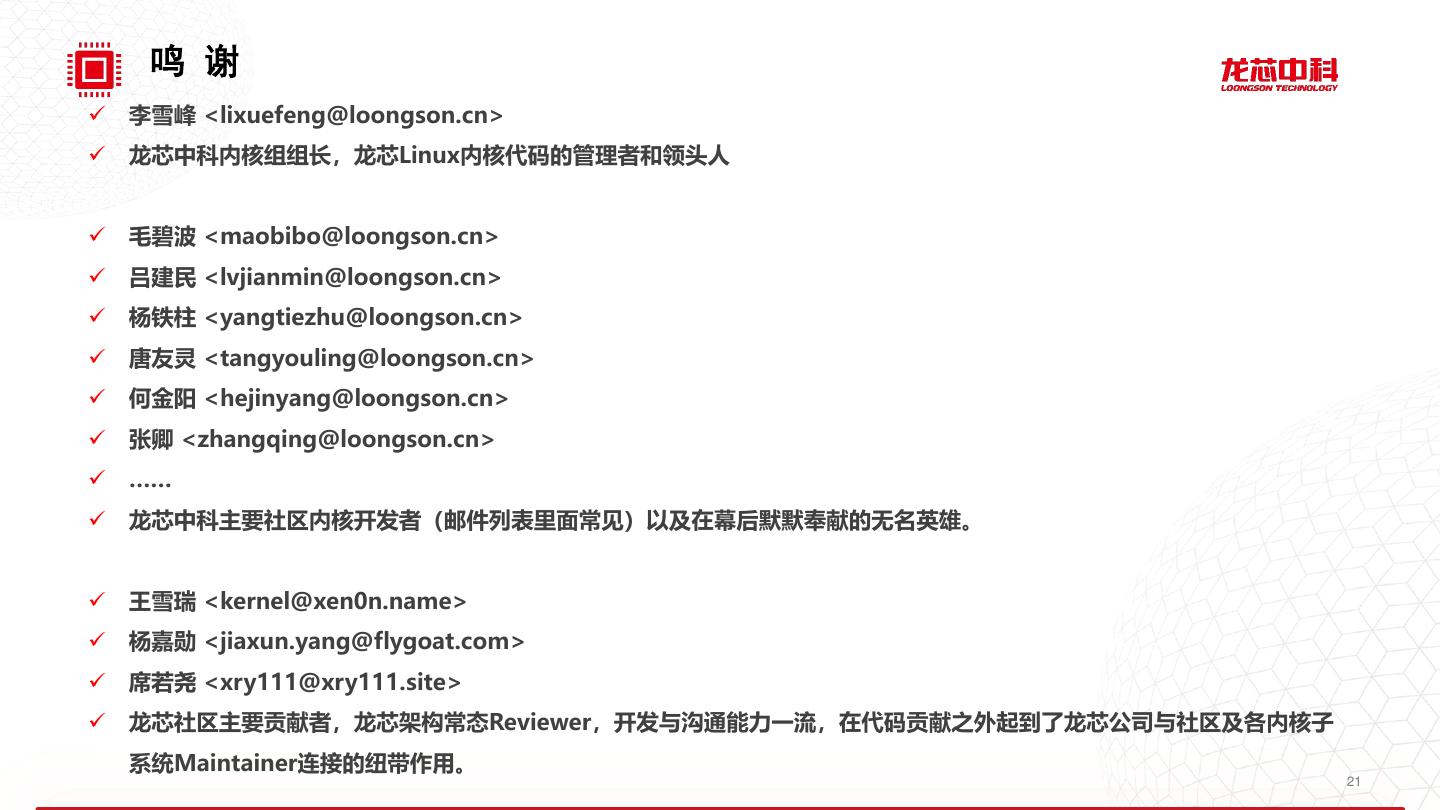 21 . 鸣 谢 ✓ 李雪峰 <lixuefeng@loongson.cn> ✓ 龙芯中科内核组组长,龙芯Linux内核代码的管理者和领头人 ✓ 毛碧波 <maobibo@loongson.cn> ✓ 吕建民 <lvjianmin@loongson.cn> ✓ 杨铁柱 <yangtiezhu@loongson.cn> ✓ 唐友灵 <tangyouling@loongson.cn> ✓ 何金阳 <hejinyang@loongson.cn> ✓ 张卿 <zhangqing@loongson.cn> ✓ …… ✓ 龙芯中科主要社区内核开发者(邮件列表里面常见)以及在幕后默默奉献的无名英雄。 ✓ 王雪瑞 <kernel@xen0n.name> ✓ 杨嘉勋 <jiaxun.yang@flygoat.com> ✓ 席若尧 <xry111@xry111.site> ✓ 龙芯社区主要贡献者,龙芯架构常态Reviewer,开发与沟通能力一流,在代码贡献之外起到了龙芯公司与社区及各内核子 系统Maintainer连接的纽带作用。 21