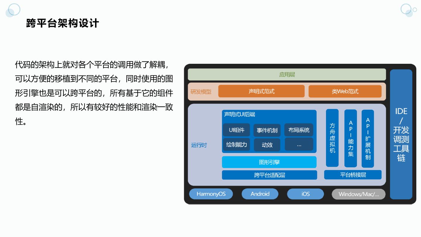 5 . 跨平台架构设计 代码的架构上就对各个平台的调用做了解耦, 可以方便的移植到不同的平台,同时使用的图 形引擎也是可以跨平台的,所有基于它的组件 都是自渲染的,所以有较好的性能和渲染一致 性。