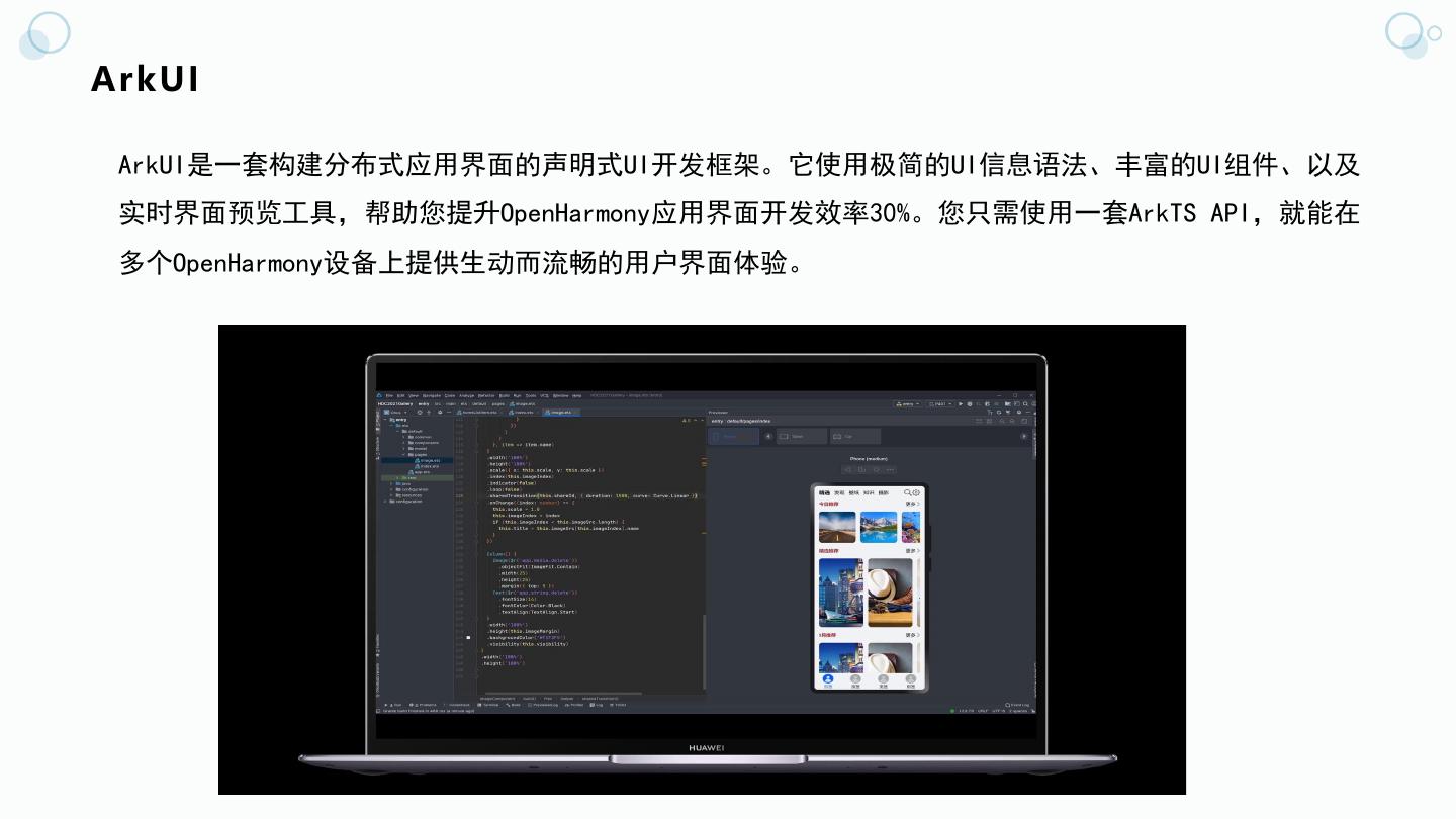 13 .ArkUI ArkUI是一套构建分布式应用界面的声明式UI开发框架。它使用极简的UI信息语法、丰富的UI组件、以及 实时界面预览工具,帮助您提升OpenHarmony应用界面开发效率30%。您只需使用一套ArkTS API,就能在 多个OpenHarmony设备上提供生动而流畅的用户界面体验。
