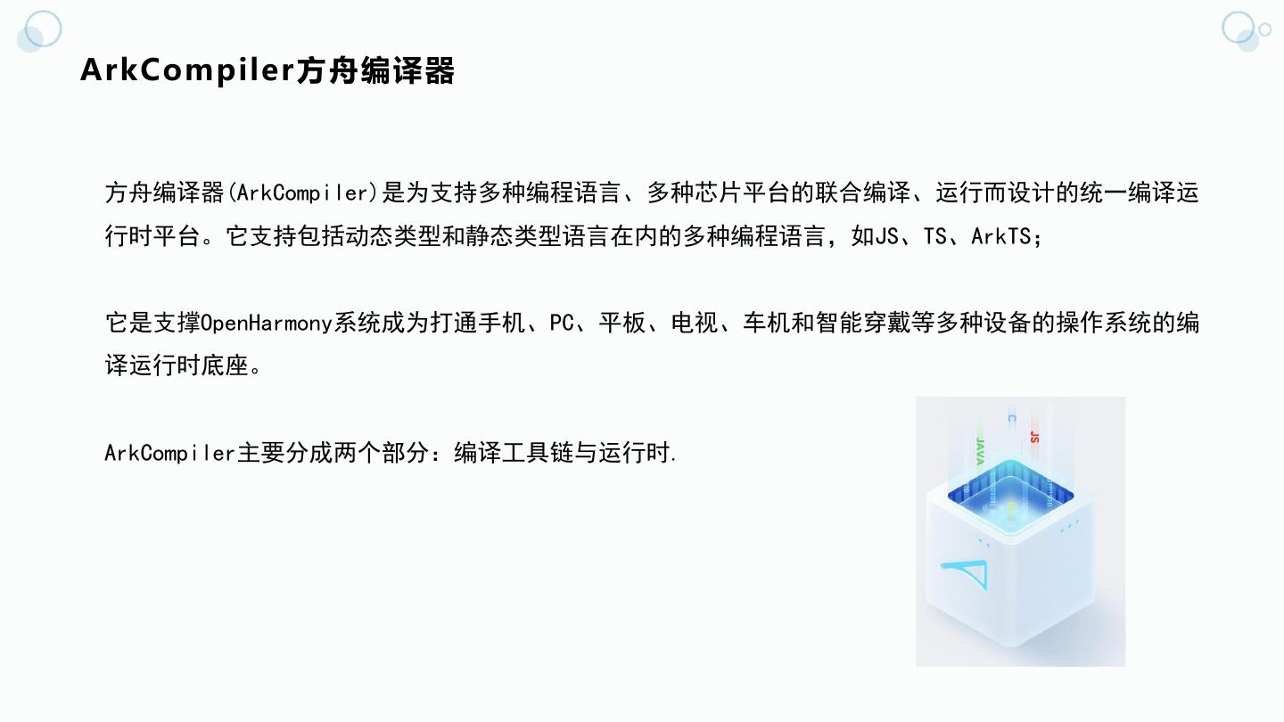 19 .ArkCompiler 方舟编译器 方舟编译器(ArkCompiler)是为支持多种编程语言、多种芯片平台的联合编译、运行而设计的统一编译运 行时平台。它支持包括动态类型和静态类型语言在内的多种编程语言,如JS、TS、ArkTS; 它是支撑OpenHarmony系统成为打通手机、PC、平板、电视、车机和智能穿戴等多种设备的操作系统的编 译运行时底座。 ArkCompiler主要分成两个部分:编译工具链与运行时.