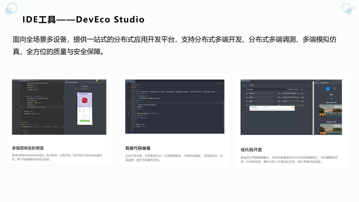 22 . IDE工具——DevEco Studio 面向全场景多设备,提供一站式的分布式应用开发平台,支持分布式多端开发、分布式多端调测、多端模拟仿 真,全方位的质量与安全保障。