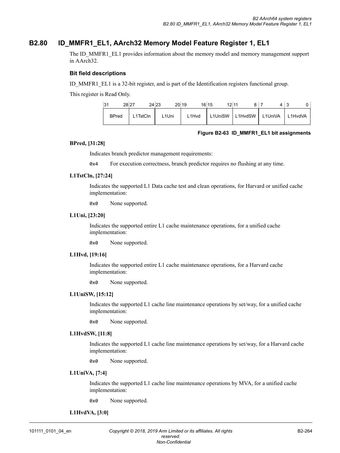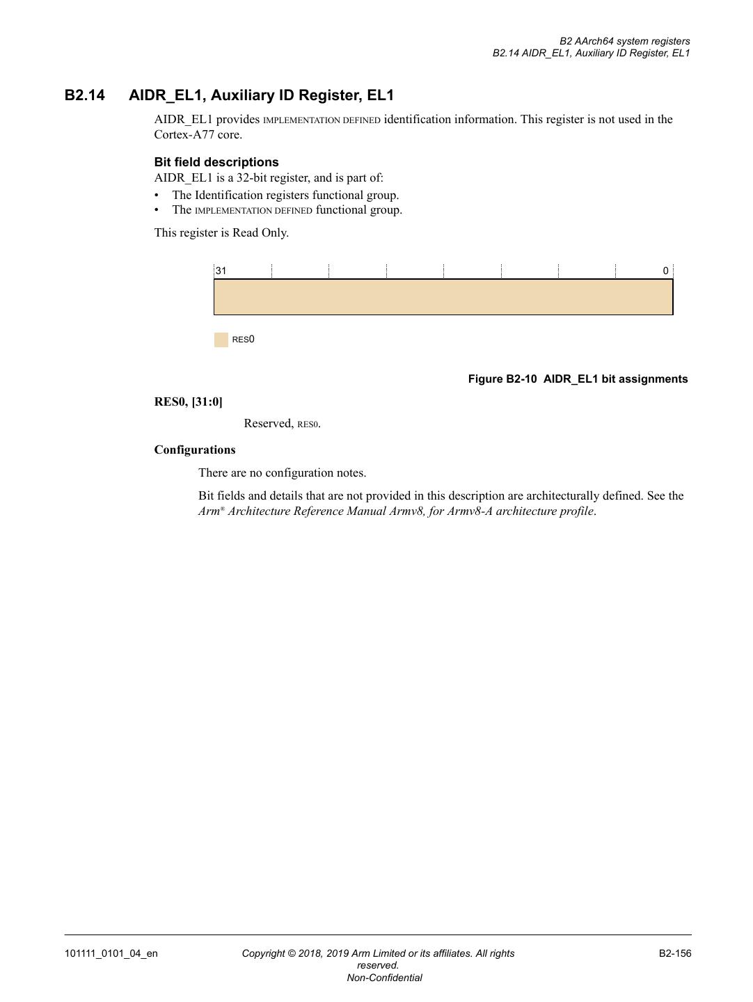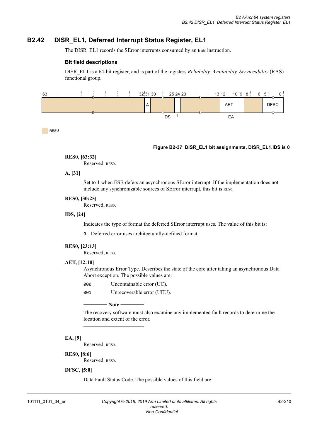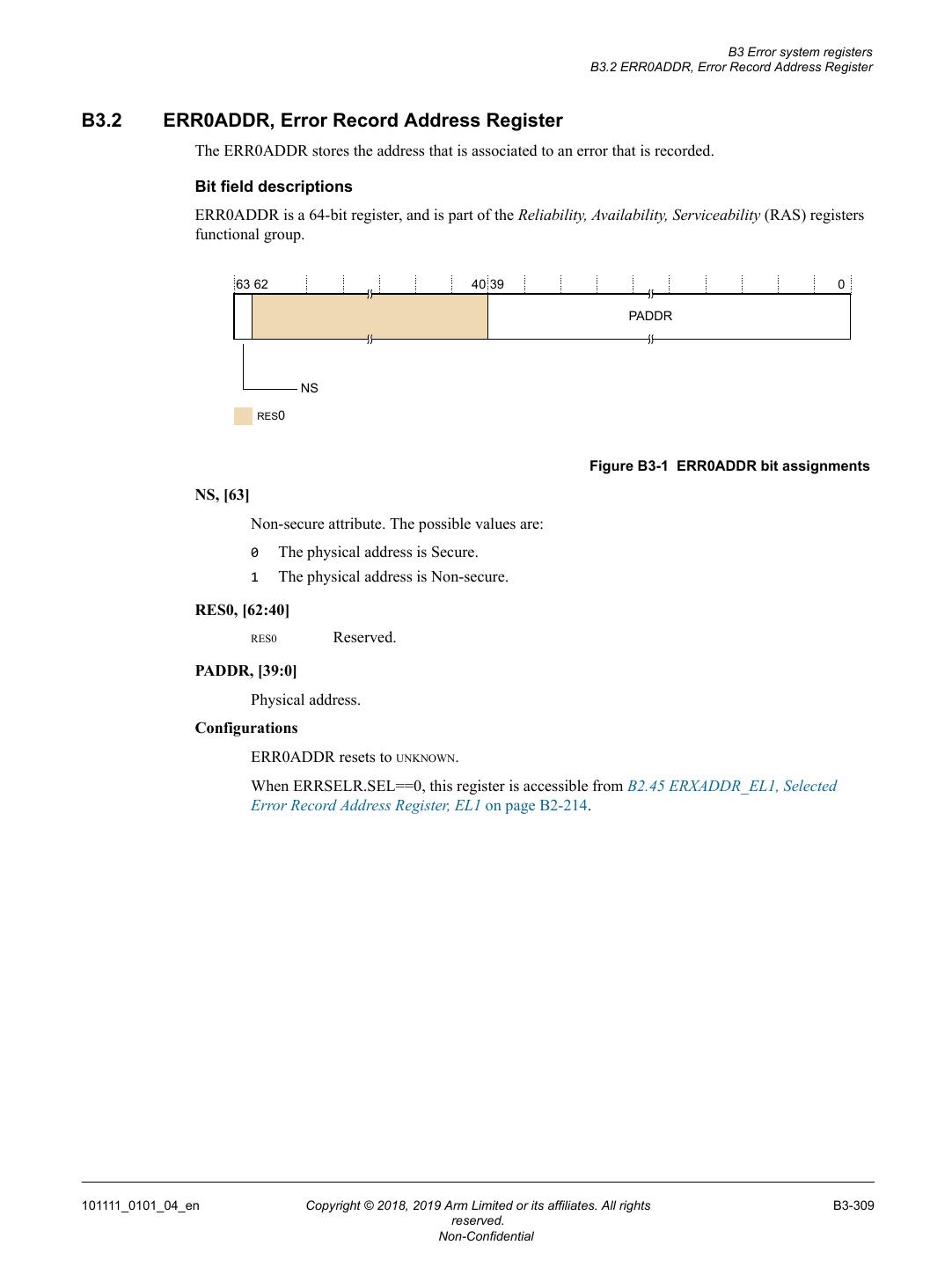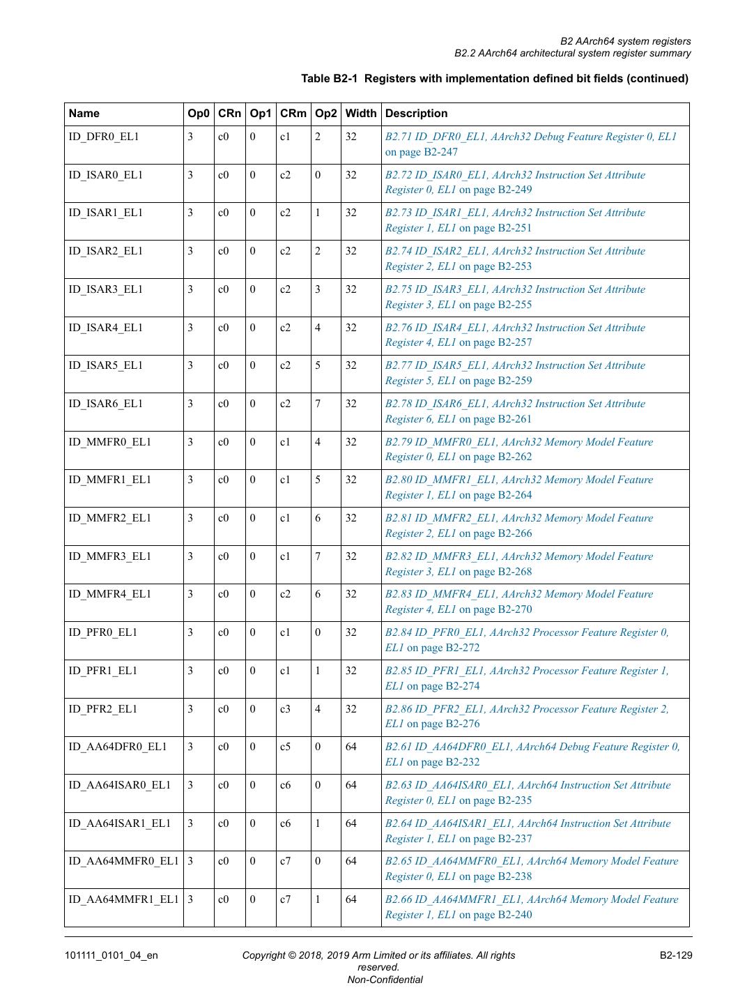 8 . B2.45 ERXADDR_EL1, Selected Error Record Address Register, EL1 ........................ B2-214 B2.46 ERXCTLR_EL1, Selected Error Record Control Register, EL1 .......................... B2-215 B2.47 ERXFR_EL1, Selected Error Record Feature Register, EL1 .............................. B2-216 B2.48 ERXMISC0_EL1, Selected Error Record Miscellaneous Register 0, EL1 .......... B2-217 B2.49 ERXMISC1_EL1, Selected Error Record Miscellaneous Register 1, EL1 .......... B2-218 B2.50 ERXPFGCDN_EL1, Selected Error Pseudo Fault Generation Count Down Register, EL1 ...................................................................................................................... B2-219 B2.51 ERXPFGCTL_EL1, Selected Error Pseudo Fault Generation Control Register, EL1 .... ............................................................................................................................. B2-220 B2.52 ERXPFGF_EL1, Selected Pseudo Fault Generation Feature Register, EL1 ...... B2-222 B2.53 ERXSTATUS_EL1, Selected Error Record Primary Status Register, EL1 .......... B2-223 B2.54 ESR_EL1, Exception Syndrome Register, EL1 ......................... ......................... B2-224 B2.55 ESR_EL2, Exception Syndrome Register, EL2 ......................... ......................... B2-225 B2.56 ESR_EL3, Exception Syndrome Register, EL3 ......................... ......................... B2-226 B2.57 HACR_EL2, Hyp Auxiliary Configuration Register, EL2 ...................................... B2-227 B2.58 HCR_EL2, Hypervisor Configuration Register, EL2 ............................................ B2-228 B2.59 ID_AA64AFR0_EL1, AArch64 Auxiliary Feature Register 0 ............... ............... B2-230 B2.60 ID_AA64AFR1_EL1, AArch64 Auxiliary Feature Register 1 ............... ............... B2-231 B2.61 ID_AA64DFR0_EL1, AArch64 Debug Feature Register 0, EL1 ............ ............ B2-232 B2.62 ID_AA64DFR1_EL1, AArch64 Debug Feature Register 1, EL1 ............ ............ B2-234 B2.63 ID_AA64ISAR0_EL1, AArch64 Instruction Set Attribute Register 0, EL1 ..... ..... B2-235 B2.64 ID_AA64ISAR1_EL1, AArch64 Instruction Set Attribute Register 1, EL1 ..... ..... B2-237 B2.65 ID_AA64MMFR0_EL1, AArch64 Memory Model Feature Register 0, EL1 .... .... B2-238 B2.66 ID_AA64MMFR1_EL1, AArch64 Memory Model Feature Register 1, EL1 .... .... B2-240 B2.67 ID_AA64MMFR2_EL1, AArch64 Memory Model Feature Register 2, EL1 .... .... B2-242 B2.68 ID_AA64PFR0_EL1, AArch64 Processor Feature Register 0, EL1 .................... B2-243 B2.69 ID_AA64PFR1_EL1, AArch64 Processor Feature Register 1, EL1 .................... B2-245 B2.70 ID_AFR0_EL1, AArch32 Auxiliary Feature Register 0, EL1 ............... ............... B2-246 B2.71 ID_DFR0_EL1, AArch32 Debug Feature Register 0, EL1 .................................. B2-247 B2.72 ID_ISAR0_EL1, AArch32 Instruction Set Attribute Register 0, EL1 .................... B2-249 B2.73 ID_ISAR1_EL1, AArch32 Instruction Set Attribute Register 1, EL1 .................... B2-251 B2.74 ID_ISAR2_EL1, AArch32 Instruction Set Attribute Register 2, EL1 .................... B2-253 B2.75 ID_ISAR3_EL1, AArch32 Instruction Set Attribute Register 3, EL1 .................... B2-255 B2.76 ID_ISAR4_EL1, AArch32 Instruction Set Attribute Register 4, EL1 .................... B2-257 B2.77 ID_ISAR5_EL1, AArch32 Instruction Set Attribute Register 5, EL1 .................... B2-259 B2.78 ID_ISAR6_EL1, AArch32 Instruction Set Attribute Register 6, EL1 .................... B2-261 B2.79 ID_MMFR0_EL1, AArch32 Memory Model Feature Register 0, EL1 .................. B2-262 B2.80 ID_MMFR1_EL1, AArch32 Memory Model Feature Register 1, EL1 .................. B2-264 B2.81 ID_MMFR2_EL1, AArch32 Memory Model Feature Register 2, EL1 .................. B2-266 B2.82 ID_MMFR3_EL1, AArch32 Memory Model Feature Register 3, EL1 .................. B2-268 B2.83 ID_MMFR4_EL1, AArch32 Memory Model Feature Register 4, EL1 .................. B2-270 B2.84 ID_PFR0_EL1, AArch32 Processor Feature Register 0, EL1 .............. .............. B2-272 B2.85 ID_PFR1_EL1, AArch32 Processor Feature Register 1, EL1 .............. .............. B2-274 B2.86 ID_PFR2_EL1, AArch32 Processor Feature Register 2, EL1 .............. .............. B2-276 B2.87 LORC_EL1, LORegion Control Register, EL1 .......................... .......................... B2-277 B2.88 LORID_EL1, LORegion ID Register, EL1 ............................. ............................. B2-278 B2.89 LORN_EL1, LORegion Number Register, EL1 ......................... ......................... B2-279 B2.90 MDCR_EL3, Monitor Debug Configuration Register, EL3 ................. ................. B2-280 B2.91 MIDR_EL1, Main ID Register, EL1 ...................................................................... B2-282 B2.92 MPIDR_EL1, Multiprocessor Affinity Register, EL1 ...................... ...................... B2-283 101111_0101_04_en Copyright © 2018, 2019 Arm Limited or its affiliates. All rights 8 reserved. Non-Confidential