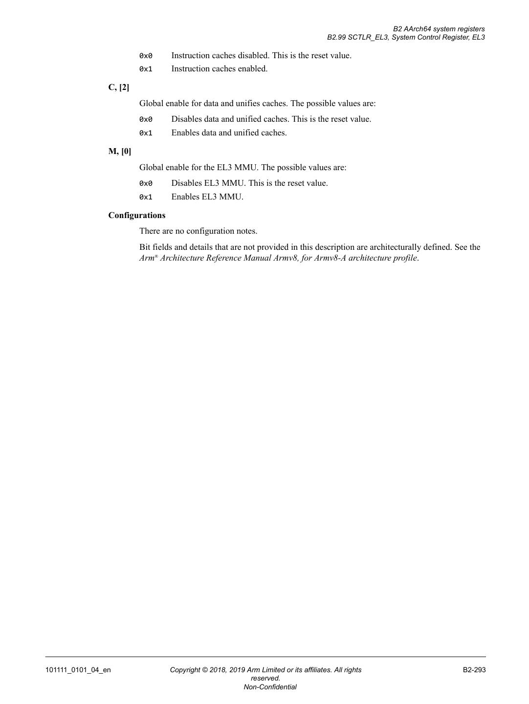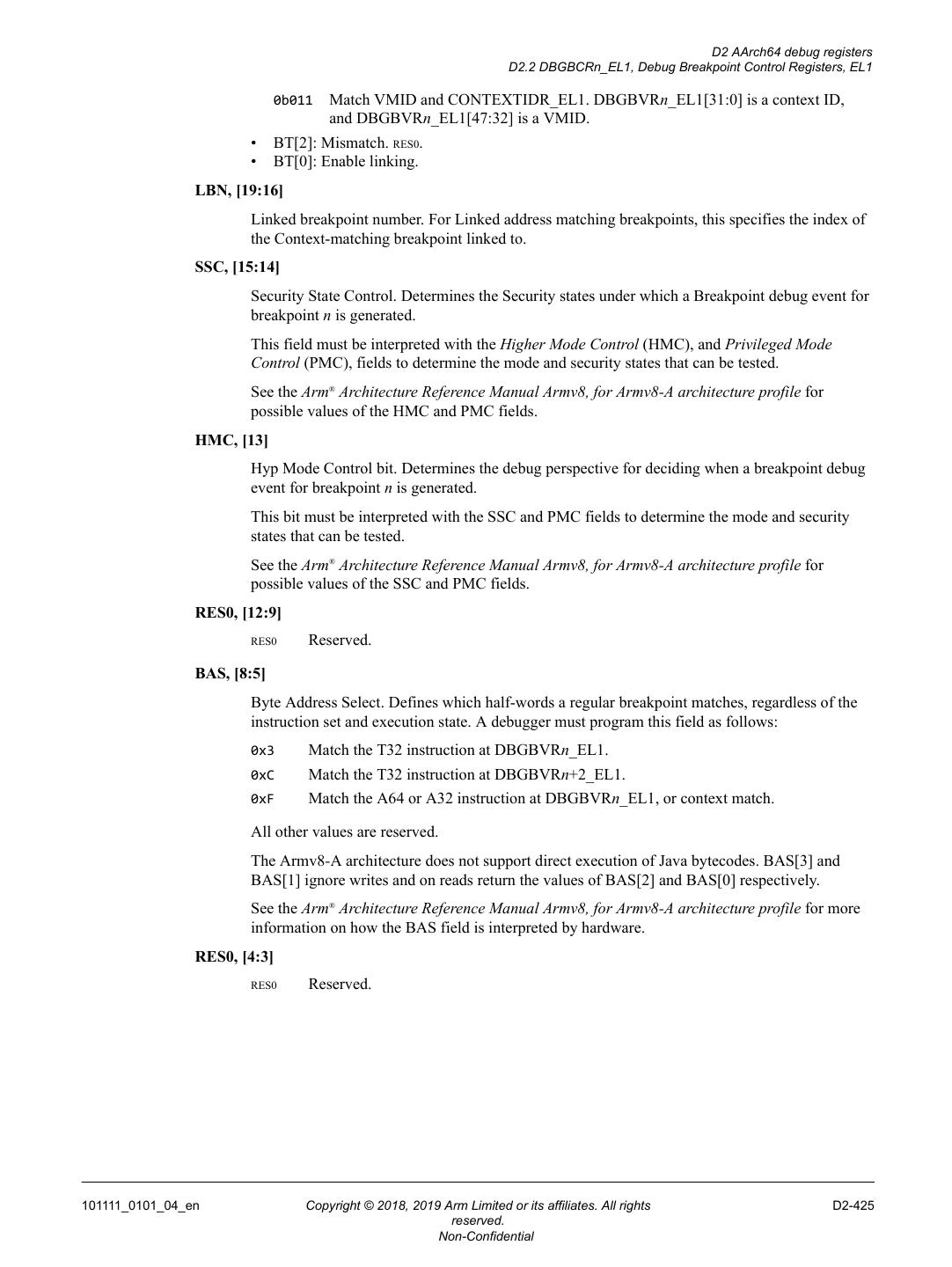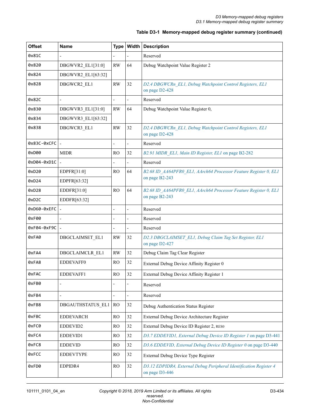 11 . C4.7 Interaction with the PMU and Debug .................................................................. C4-415 Part D Debug registers Chapter D1 AArch32 debug registers D1.1 AArch32 debug register summary ................................... ................................... D1-420 Chapter D2 AArch64 debug registers D2.1 AArch64 debug register summary ................................... ................................... D2-422 D2.2 DBGBCRn_EL1, Debug Breakpoint Control Registers, EL1 .............................. D2-424 D2.3 DBGCLAIMSET_EL1, Debug Claim Tag Set Register, EL1 ............... ............... D2-427 D2.4 DBGWCRn_EL1, Debug Watchpoint Control Registers, EL1 .............. .............. D2-428 Chapter D3 Memory-mapped debug registers D3.1 Memory-mapped debug register summary ............................ ............................ D3-432 D3.2 EDCIDR0, External Debug Component Identification Register 0 ........... ........... D3-436 D3.3 EDCIDR1, External Debug Component Identification Register 1 ........... ........... D3-437 D3.4 EDCIDR2, External Debug Component Identification Register 2 ........... ........... D3-438 D3.5 EDCIDR3, External Debug Component Identification Register 3 ........... ........... D3-439 D3.6 EDDEVID, External Debug Device ID Register 0 ....................... ....................... D3-440 D3.7 EDDEVID1, External Debug Device ID Register 1 ...................... ...................... D3-441 D3.8 EDPIDR0, External Debug Peripheral Identification Register 0 .......................... D3-442 D3.9 EDPIDR1, External Debug Peripheral Identification Register 1 .......................... D3-443 D3.10 EDPIDR2, External Debug Peripheral Identification Register 2 .......................... D3-444 D3.11 EDPIDR3, External Debug Peripheral Identification Register 3 .......................... D3-445 D3.12 EDPIDR4, External Debug Peripheral Identification Register 4 .......................... D3-446 D3.13 EDPIDRn, External Debug Peripheral Identification Registers 5-7 .......... .......... D3-447 D3.14 EDRCR, External Debug Reserve Control Register ..................... ..................... D3-448 Chapter D4 AArch32 PMU registers D4.1 AArch32 PMU register summary .................................... .................................... D4-450 D4.2 PMCEID0, Performance Monitors Common Event Identification Register 0 ...... D4-452 D4.3 PMCEID1, Performance Monitors Common Event Identification Register 1 ...... D4-455 D4.4 PMCR, Performance Monitors Control Register ........................ ........................ D4-457 Chapter D5 AArch64 PMU registers D5.1 AArch64 PMU register summary .................................... .................................... D5-462 D5.2 PMCEID0_EL0, Performance Monitors Common Event Identification Register 0, EL0 .. ............................................................................................................................. D5-464 D5.3 PMCEID1_EL0, Performance Monitors Common Event Identification Register 1, EL0 .. ............................................................................................................................. D5-467 D5.4 PMCR_EL0, Performance Monitors Control Register, EL0 ................ ................ D5-469 Chapter D6 Memory-mapped PMU registers D6.1 Memory-mapped PMU register summary ............................. ............................. D6-472 D6.2 PMCFGR, Performance Monitors Configuration Register .................................. D6-476 D6.3 PMCIDR0, Performance Monitors Component Identification Register 0 ............ D6-477 D6.4 PMCIDR1, Performance Monitors Component Identification Register 1 ............ D6-478 D6.5 PMCIDR2, Performance Monitors Component Identification Register 2 ............ D6-479 D6.6 PMCIDR3, Performance Monitors Component Identification Register 3 ............ D6-480 D6.7 PMPIDR0, Performance Monitors Peripheral Identification Register 0 ....... ....... D6-481 101111_0101_04_en Copyright © 2018, 2019 Arm Limited or its affiliates. All rights 11 reserved. Non-Confidential