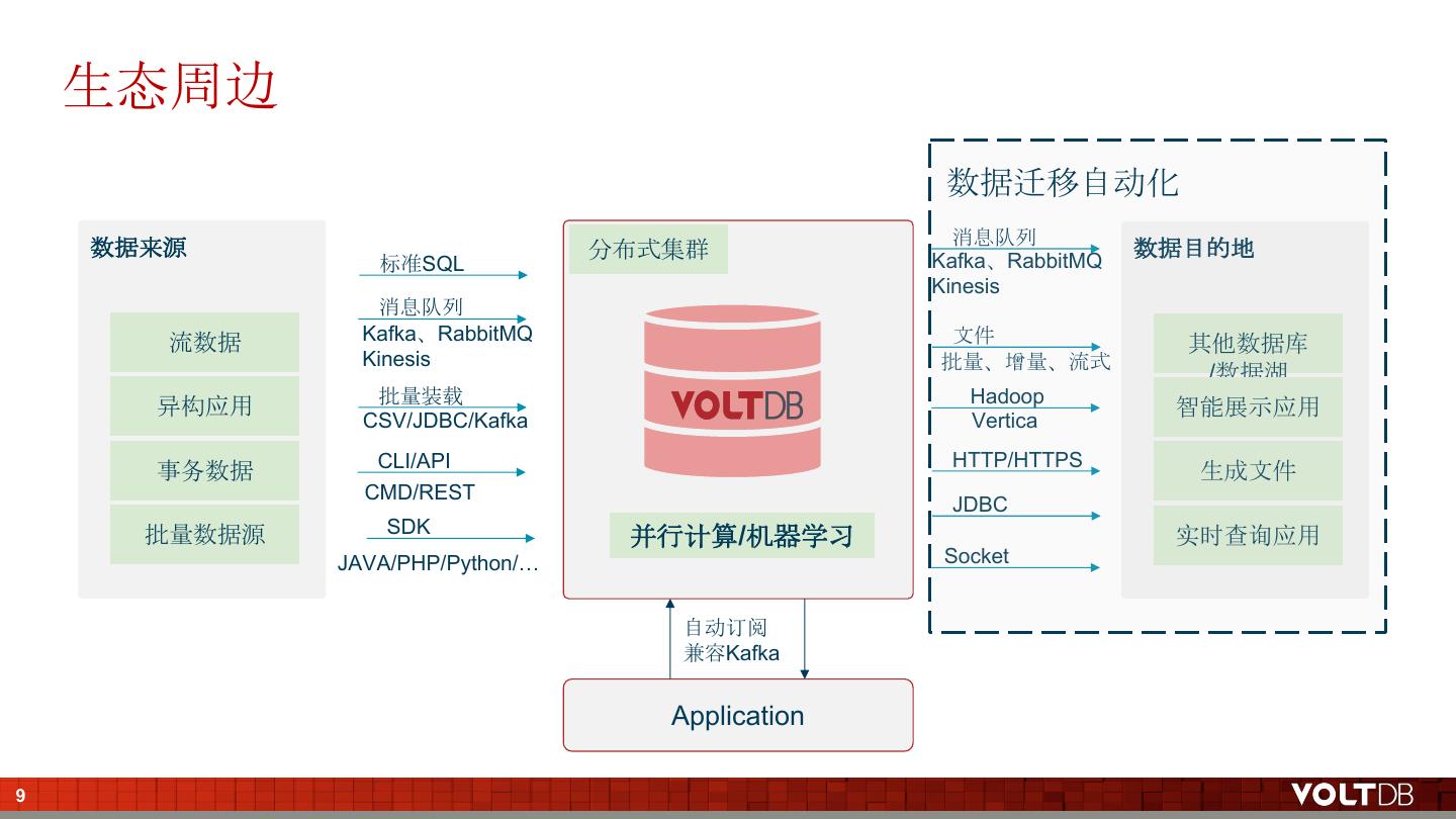 8 . 安全易用 标准SQL ACID VOLTDB使用标准SQL,包括 CREATE INDEX,CREATE VOLTDB能够在保证事务完整性的同时提供并发和性能线性 TABLE, CREATE VIEW ,SELECT, INSERT, UPDATE, DELETE操 扩展的能力;VOLTDB把每个事务都当作一个存储过程, 保证数据一 作等。学习成本和代码迁移成本很低,代码复用程度高,现有使用SQL 致性。传统的数据库为了保证事务完整性,往往耗费非常多的CPU 实现的应用,可以相对容易的迁移到VOLTDB。 资源在锁、插销和缓冲区管理这些执行准备工作上,阻碍了数据库的 性能和扩展能力。VOLTDB通过全局事务串行执行和单线程分区并行 执行,保证事务执行串行隔离,同时避免了锁的使用和缓冲区的管理 ,同时满足ACID和高性能。 复杂计算 VOLTDB使用行式结构化数据存储,兼容JAVA数据类型,同 时提供了多表JOIN、聚合、窗口、地理等查询。同时,VOLTDB 提供 JDBC 数据即席查询(Ad-Hoc),可根据自己的需求灵活的选择查询条件,以作 VOLTDB兼容JDBC,允许用户进行动态的SQL查询,动态 为实时数据分析和实时数仓使用。 SQL查询也能参与存储结构优化,所以可根据应用需求结合预先编好存 储过程一起使用。 8