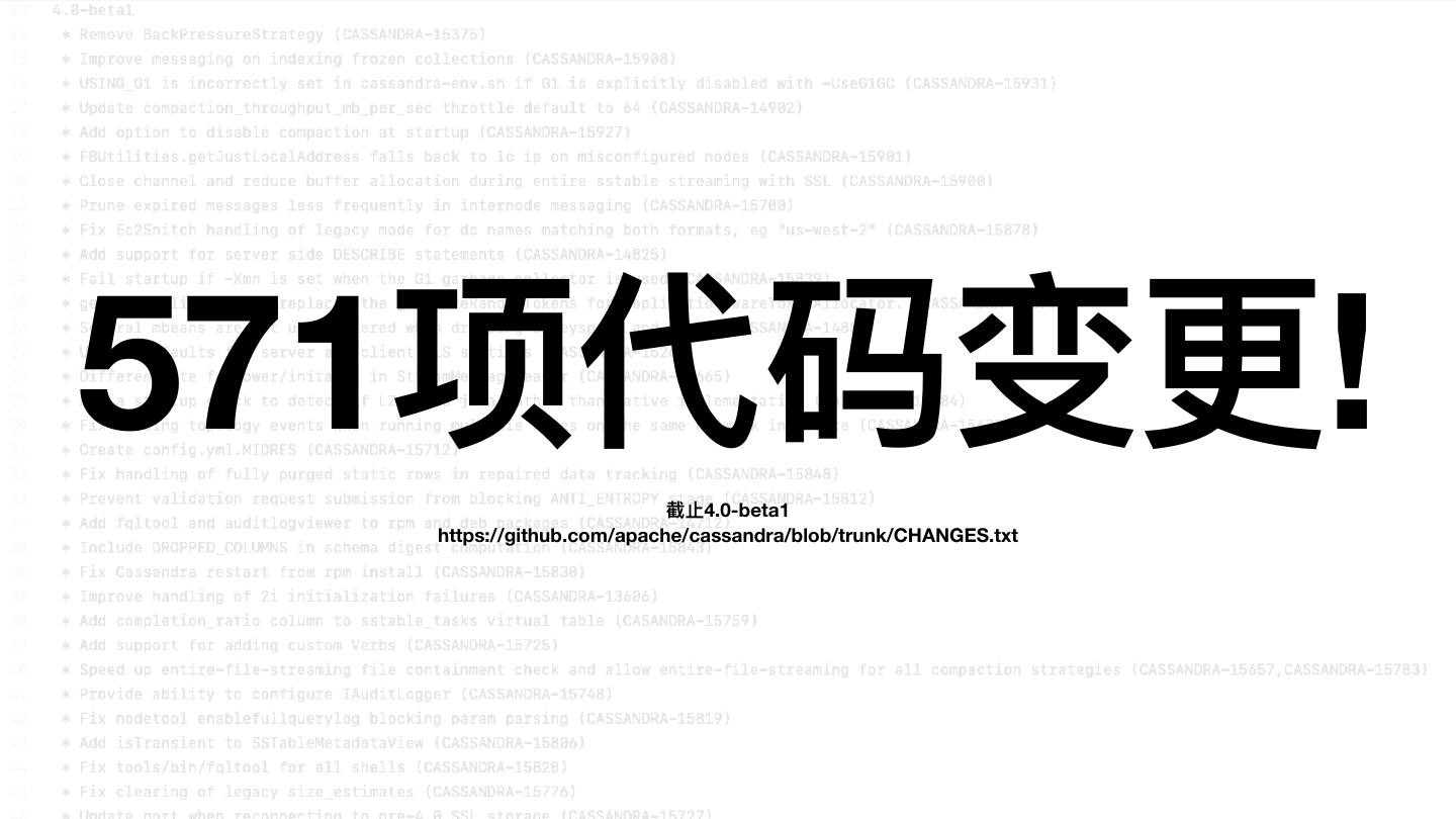 3 .571项代码变更! 截⽌4.0-beta1 https://github.com/apache/cassandra/blob/trunk/CHANGES.txt