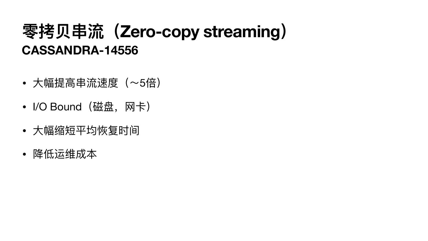 8 .零拷⻉串流(Zero-copy streaming) CASSANDRA-14556 • ⼤幅提⾼串流速度(~5倍) • I/O Bound(磁盘,⽹卡) • ⼤幅缩短平均恢复时间 • 降低运维成本