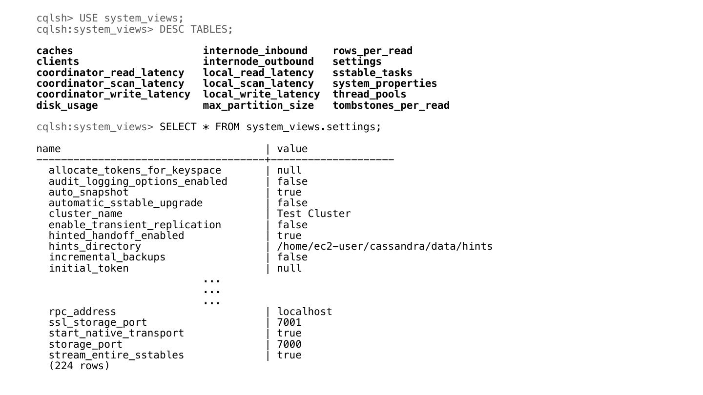 11 .cqlsh> USE system_views; cqlsh:system_views> DESC TABLES; caches internode_inbound rows_per_read clients internode_outbound settings coordinator_read_latency local_read_latency sstable_tasks coordinator_scan_latency local_scan_latency system_properties coordinator_write_latency local_write_latency thread_pools disk_usage max_partition_size tombstones_per_read cqlsh:system_views> SELECT * FROM system_views.settings; name | value -------------------------------------+-------------------- allocate_tokens_for_keyspace | null audit_logging_options_enabled | false auto_snapshot | true automatic_sstable_upgrade | false cluster_name | Test Cluster enable_transient_replication | false hinted_handoff_enabled | true hints_directory | /home/ec2-user/cassandra/data/hints incremental_backups | false initial_token | null ... ... ... rpc_address | localhost ssl_storage_port | 7001 start_native_transport | true storage_port | 7000 stream_entire_sstables | true (224 rows)
