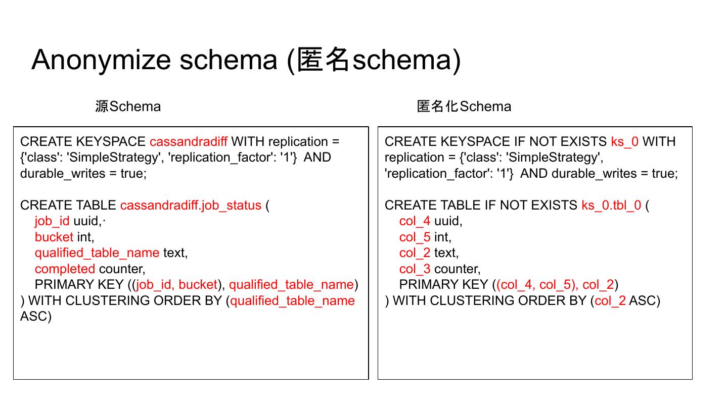 20 . Anonymize schema (匿名schema) 源Schema 匿名化Schema CREATE KEYSPACE cassandradiff WITH replication = CREATE KEYSPACE IF NOT EXISTS ks_0 WITH {'class': 'SimpleStrategy', 'replication_factor': '1'} AND replication = {'class': 'SimpleStrategy', durable_writes = true; 'replication_factor': '1'} AND durable_writes = true; CREATE TABLE cassandradiff.job_status ( CREATE TABLE IF NOT EXISTS ks_0.tbl_0 ( job_id uuid,· col_4 uuid, bucket int, col_5 int, qualified_table_name text, col_2 text, completed counter, col_3 counter, PRIMARY KEY ((job_id, bucket), qualified_table_name) PRIMARY KEY ((col_4, col_5), col_2) ) WITH CLUSTERING ORDER BY (qualified_table_name ) WITH CLUSTERING ORDER BY (col_2 ASC) ASC)