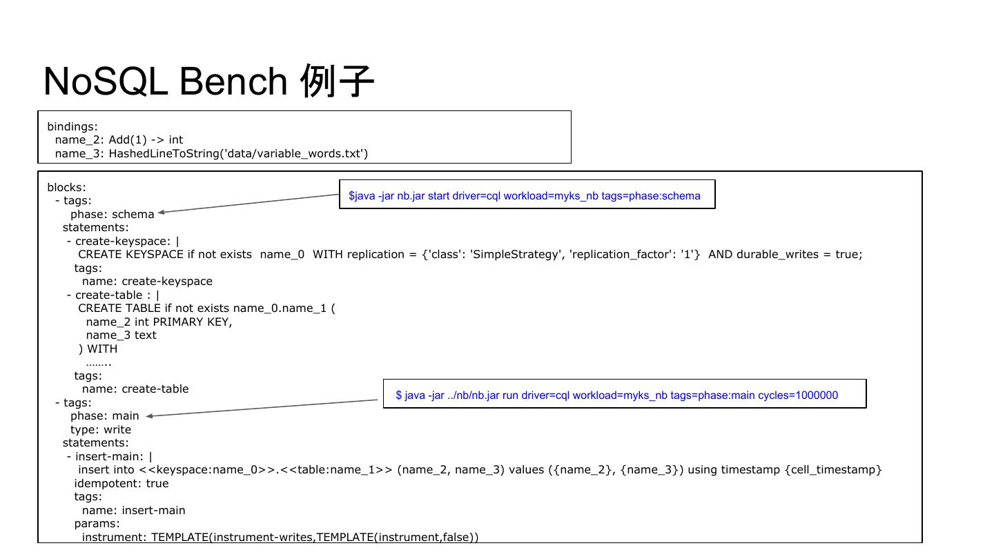 22 .NoSQL Bench 例子 bindings: name_2: Add(1) -> int name_3: HashedLineToString('data/variable_words.txt') blocks: - tags: $java -jar nb.jar start driver=cql workload=myks_nb tags=phase:schema phase: schema statements: - create-keyspace: | CREATE KEYSPACE if not exists name_0 WITH replication = {'class': 'SimpleStrategy', 'replication_factor': '1'} AND durable_writes = true; tags: name: create-keyspace - create-table : | CREATE TABLE if not exists name_0.name_1 ( name_2 int PRIMARY KEY, name_3 text ) WITH …….. tags: name: create-table $ java -jar ../nb/nb.jar run driver=cql workload=myks_nb tags=phase:main cycles=1000000 - tags: phase: main type: write statements: - insert-main: | insert into <<keyspace:name_0>>.<<table:name_1>> (name_2, name_3) values ({name_2}, {name_3}) using timestamp {cell_timestamp} idempotent: true tags: name: insert-main params: instrument: TEMPLATE(instrument-writes,TEMPLATE(instrument,false))