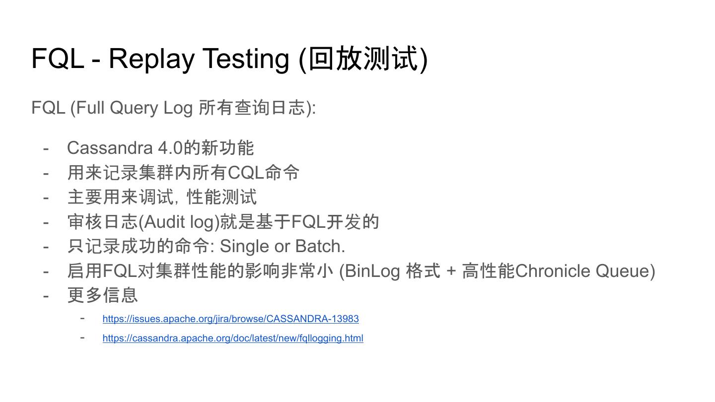 23 .FQL - Replay Testing (回放测试) FQL (Full Query Log 所有查询日志): - Cassandra 4.0的新功能 - 用来记录集群内所有CQL命令 - 主要用来调试,性能测试 - 审核日志(Audit log)就是基于FQL开发的 - 只记录成功的命令: Single or Batch. - 启用FQL对集群性能的影响非常小 (BinLog 格式 + 高性能Chronicle Queue) - 更多信息 - https://issues.apache.org/jira/browse/CASSANDRA-13983 - https://cassandra.apache.org/doc/latest/new/fqllogging.html