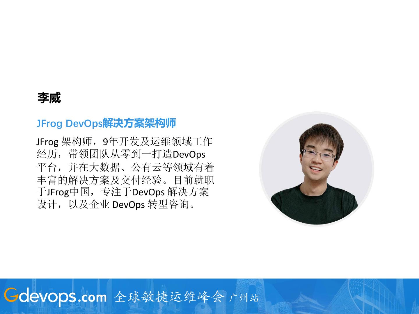 2 .李威 JFrog DevOps解决方案架构师 JFrog 架构师,9年开发及运维领域工作 经历,带领团队从零到一打造DevOps 平台,并在大数据、公有云等领域有着 丰富的解决方案及交付经验。目前就职 于JFrog中国,专注于DevOps 解决方案 设计,以及企业 DevOps 转型咨询。 全球敏捷运维峰会 广州站