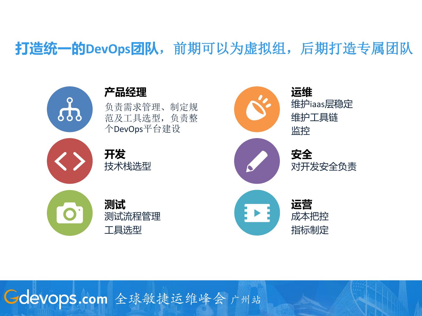 6 .打造统一的DevOps团队,前期可以为虚拟组,后期打造专属团队 产品经理 运维 负责需求管理、制定规 维护iaas层稳定 范及工具选型,负责整 维护工具链 个DevOps平台建设 监控 开发 安全 技术栈选型 对开发安全负责 测试 运营 测试流程管理 成本把控 工具选型 指标制定 全球敏捷运维峰会 广州站