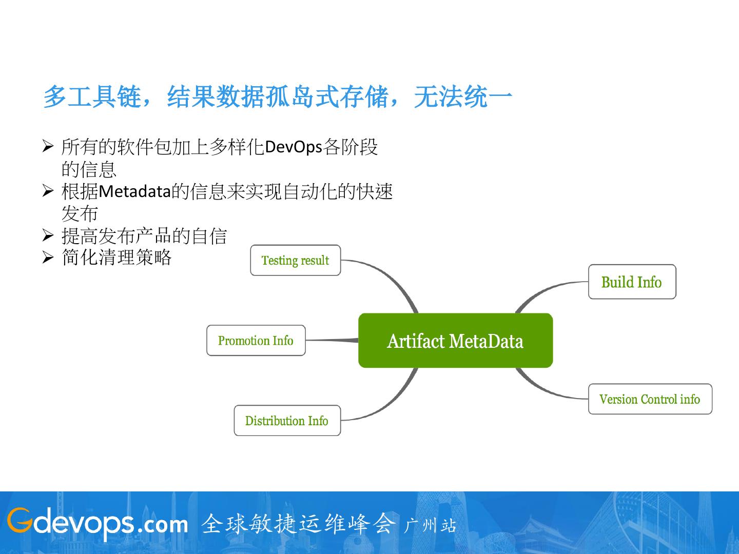 14 .多工具链,结果数据孤岛式存储,无法统一 ➢ 所有的软件包加上多样化DevOps各阶段 的信息 ➢ 根据Metadata的信息来实现自动化的快速 发布 ➢ 提高发布产品的自信 ➢ 简化清理策略 全球敏捷运维峰会 广州站